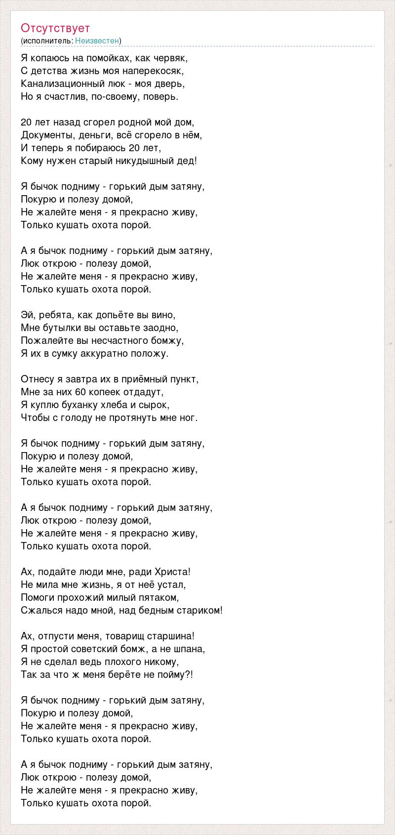 Я копаюсь на помойках, как червяк, С детства жизнь моя наперекосяк, Канализационный люк - моя дверь, Но я счастлив, по-своему, поверь. 20 лет назад сгорел родной мой дом, Документы, деньги, всё сгорело в нём, И теперь я побираюсь 20 лет, Кому нужен старый никудышный дед! Я бычок подниму - горький дым затяну, Покурю и полезу домой, Не жалейте меня - я прекрасно живу, Только кушать охота порой. А я бычок подниму - горький дым затяну, Люк открою - полезу домой, Не жалейте меня - я прекрасно живу, Только кушать охота порой. Эй, ребята, как допьёте вы вино, Мне бутылки вы оставьте заодно, Пожалейте вы несчастного бомжу, Я их в сумку аккуратно положу. Отнесу я завтра их в приёмный пункт, Мне за них 60 копеек отдадут, Я куплю буханку хлеба и сырок, Чтобы с голоду не протянуть мне ног. Я бычок подниму - горький дым затяну, Покурю и полезу домой, Не жалейте меня - я прекрасно живу, Только кушать охота порой. А я бычок подниму - горький дым затяну, Люк открою - полезу домой, Не жалейте меня - я прекрасно живу, Только кушать охота порой. Ах, подайте люди мне, ради Христа! Не мила мне жизнь, я от неё устал, Помоги прохожий милый пятаком, Сжалься надо мной, над бедным стариком! Ах, отпусти меня, товарищ старшина! Я простой советский бомж, а не шпана, Я не сделал ведь плохого никому, Так за что ж меня берёте не пойму?! Я бычок подниму - горький дым затяну, Покурю и полезу домой, Не жалейте меня - я прекрасно живу, Только кушать охота порой. А я бычок подниму - горький дым затяну, Люк открою - полезу домой, Не жалейте меня - я прекрасно живу, Только кушать охота порой.