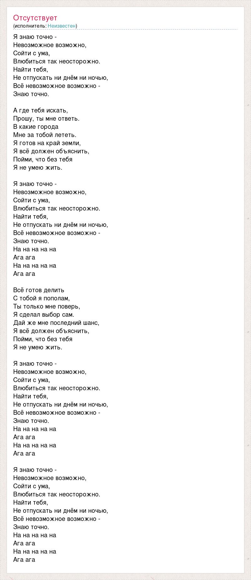 Я знаю точно - Невозможное возможно, Сойти с ума, Влюбиться так неосторожно. Найти тебя, Не отпускать ни днём ни ночью, Всё невозможное возможно - Знаю точно. А где тебя искать, Прошу, ты мне ответь. В какие города Мне за тобой лететь. Я готов на край земли, Я всё должен объяснить, Пойми, что без тебя Я не умею жить. Я знаю точно - Невозможное возможно, Сойти с ума, Влюбиться так неосторожно. Найти тебя, Не отпускать ни днём ни ночью, Всё невозможное возможно - Знаю точно. На на на на на Ага ага На на на на на Ага ага Всё готов делить С тобой я пополам, Ты только мне поверь, Я сделал выбор сам. Дай же мне последний шанс, Я всё должен объяснить, Пойми, что без тебя Я не умею жить. Я знаю точно - Невозможное возможно, Сойти с ума, Влюбиться так неосторожно. Найти тебя, Не отпускать ни днём ни ночью, Всё невозможное возможно - Знаю точно. На на на на на Ага ага На на на на на Ага ага Я знаю точно - Невозможное возможно, Сойти с ума, Влюбиться так неосторожно. Найти тебя, Не отпускать ни днём ни ночью, Всё невозможное возможно - Знаю точно. На на на на на Ага ага На на на на на Ага ага