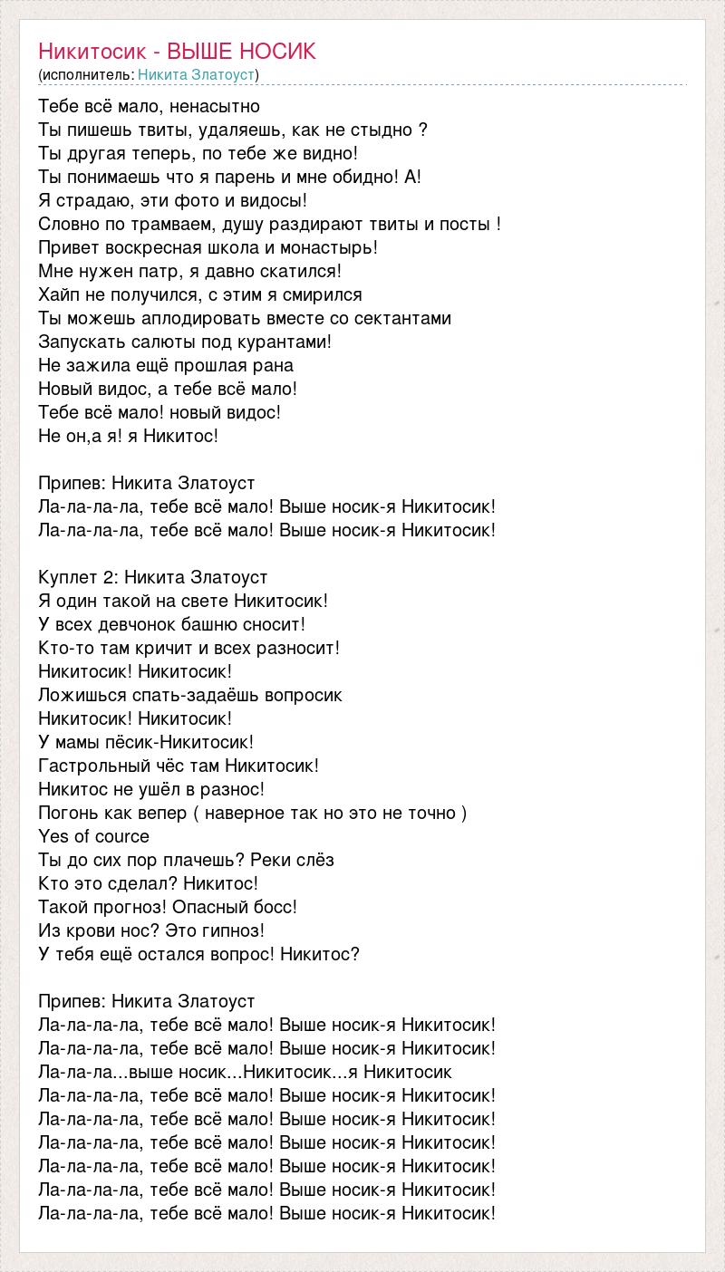 Тебе всё мало, ненасытно Ты пишешь твиты, удаляешь, как не стыдно ? Ты другая теперь, по тебе же видно! Ты понимаешь что я парень и мне обидно! А! Я страдаю, эти фото и видосы! Словно по трамваем, душу раздирают твиты и посты ! Привет воскресная школа и монастырь! Мне нужен патр, я давно скатился! Хайп не получился, с этим я смирился Ты можешь аплодировать вместе со сектантами Запускать салюты под курантами! Не зажила ещё прошлая рана Новый видос, а тебе всё мало! Тебе всё мало! новый видос! Не он,а я! я Никитос! Припев: Никита Златоуст Ла-ла-ла-ла, тебе всё мало! Выше носик-я Никитосик! Ла-ла-ла-ла, тебе всё мало! Выше носик-я Никитосик! Куплет 2: Никита Златоуст Я один такой на свете Никитосик! У всех девчонок башню сносит! Кто-то там кричит и всех разносит! Никитосик! Никитосик! Ложишься спать-задаёшь вопросик Никитосик! Никитосик! У мамы пёсик-Никитосик! Гастрольный чёс там Никитосик! Никитос не ушёл в разнос! Погонь как вепер ( наверное так но это не точно ) Yes of cource Ты до сих пор плачешь? Реки слёз Кто это сделал? Никитос! Такой прогноз! Опасный босс! Из крови нос? Это гипноз! У тебя ещё остался вопрос! Никитос? Припев: Никита Златоуст Ла-ла-ла-ла, тебе всё мало! Выше носик-я Никитосик! Ла-ла-ла-ла, тебе всё мало! Выше носик-я Никитосик! Ла-ла-ла...выше носик...Никитосик...я Никитосик Ла-ла-ла-ла, тебе всё мало! Выше носик-я Никитосик! Ла-ла-ла-ла, тебе всё мало! Выше носик-я Никитосик! Ла-ла-ла-ла, тебе всё мало! Выше носик-я Никитосик! Ла-ла-ла-ла, тебе всё мало! Выше носик-я Никитосик! Ла-ла-ла-ла, тебе всё мало! Выше носик-я Никитосик! Ла-ла-ла-ла, тебе всё мало! Выше носик-я Никитосик!