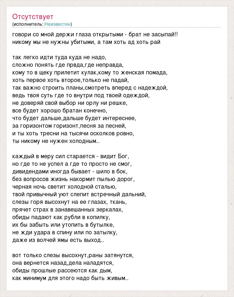 говори со мной держи глаза открытыми - брат не засыпай!! никому мы не нужны убитыми, а там хоть ад хоть рай так легко идти туда куда не надо, сложно понять где првда,где неправда, кому то в щеку прилетит кулак,кому то женская помада, хоть первое хоть второе,только не падай, так важно строить планы,смотреть вперед с надеждой, ведь твоя суть где то внутри под твоей одеждой, не доверяй свой выбор ни орлу ни решке, все будет хорошо братан конечно, что будет дальше,дальше будет интереснее, за горизонтом горизонт,песня за песней, и ты хоть тресни на тысячи осколков ровно, ты никому не нужен холодным.. каждый в меру сил старается - видит Бог, но где то не успел а где то просто не смог, дивидендами иногда бывает - шило в бок, без вопросов жизнь накормит пылью дорог, черная ночь светит холодной сталью, твой привычный уют слепит встречный дальний, слезы горя высохнут на ее глазах, ткань, прячет страх в занавешанных зеркалах, обиды падают как рубли в копилку, их бы забыть или утопить в бутылке, не жди удара в спину или по затылку, даже из волчей ямы есть выход.. вот только слезы высохнут,раны затянутся, она вернется назад,дела наладятся, обиды прошлые рассеются как дым, как минимум для этого надо быть живым..