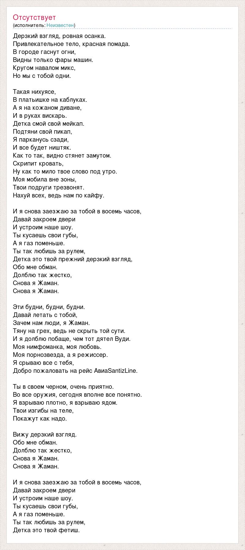 Дерзкий взгляд, ровная осанка. Привлекательное тело, красная помада. В городе гаснут огни, Видны только фары машин. Кругом навалом микс, Но мы с тобой одни. Такая нихуясе, В платьишке на каблуках. А я на кожаном диване, И в руках вискарь. Детка смой свой мейкап. Подтяни свой пикап, Я парканусь сзади, И все будет ништяк. Как то так, видно стянет замутом. Скрипит кровать, Ну как то мило твое слово под утро. Моя мобила вне зоны, Твои подруги трезвонят. Нахуй всех, ведь нам по кайфу. И я снова заезжаю за тобой в восемь часов, Давай закроем двери И устроим наше шоу. Ты кусаешь свои губы, А я газ поменьше. Ты так любишь за рулем, Детка это твой прежний дерзкий взгляд, Обо мне обман. Долблю так жестко, Снова я Жаман. Снова я Жаман. Эти будни, будни, будни. Давай летать с тобой, Зачем нам люди, я Жаман. Тяну на грех, ведь не скрыть той сути. И я долблю побаще, чем тот дятел Вуди. Моя нимфоманка, моя любовь. Моя порнозвезда, а я режиссер. Я срываю все с тебя, Добро пожаловать на рейс АвиаSantizLine. Ты в своем черном, очень приятно. Во все оружия, сегодня вполне все понятно. Я взрываю плотно, я взрываю ядом. Твои изгибы на теле, Покажут как надо. Вижу дерзкий взгляд. Обо мне обман. Долблю так жестко, Снова я Жаман. Снова я Жаман. И я снова заезжаю за тобой в восемь часов, Давай закроем двери И устроим наше шоу. Ты кусаешь свои губы, А я газ поменьше. Ты так любишь за рулем, Детка это твой фетиш.