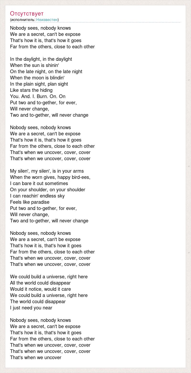Nobody sees, nobody knows We are a secret, can't be expose That's how it is, that's how it goes Far from the others, close to each other In the daylight, in the daylight When the sun is shinin' On the late night, on the late night When the moon is blindin' In the plain sight, plan sight Like stars the hiding You. And. I. Burn. On. On Put two and to-gether, for ever, Will never change, Two and to-gether, will never change Nobody sees, nobody knows We are a secret, can't be expose That's how it is, that's how it goes Far from the others, close to each other That's when we uncover, cover, cover That's when we uncover, cover, cover My silen', my silen', is in your arms When the worn gives, happy bird-ees, I can bare it out sometimes On your shoulder, on your shoulder I can reachin' endless sky Feels like paradise Put two and to-gether, for ever, Will never change, Two and to-gether, will never change Nobody sees, nobody knows We are a secret, can't be expose That's how it is, that's how it goes Far from the others, close to each other That's when we uncover, cover, cover That's when we uncover, cover, cover We could build a universe, right here All the world could disappear Would it notice, would it care We could build a universe, right here The world could disappear I just need you near Nobody sees, nobody knows We are a secret, can't be expose That's how it is, that's how it goes Far from the others, close to each other That's when we uncover, cover, cover That's when we uncover, cover, cover That's when we uncover