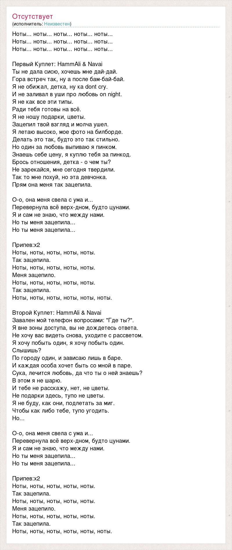 Ноты... ноты... ноты... ноты... ноты... Ноты... ноты... ноты... ноты... ноты... Ноты... ноты... ноты... ноты... ноты... Первый Куплет: HammAli & Navai Ты не дала сисю, хочешь мне дай-дай. Гора встреч так, ну а после бам-бай-бай. Я не обижал, детка, ну ка dont cry. И не заливал в уши про любовь on night. Я не как все эти типы. Ради тебя готовы на всё. Я не ношу подарки, цветы. Зацепил твой взгляд и молча ушел. Я летаю высоко, мое фото на билборде. Делать это так, будто это так стильно. Но один за любовь выпиваю я пинком. Знаешь себе цену, я куплю тебя за пинкод. Брось отношения, детка - о чем ты? Не зарекайся, мне сегодня твердили. Так то мне похуй, но эта девчонка. Прям она меня так зацепила. О-о, она меня свела с ума и... Перевернула всё верх-дном, будто цунами. Я и сам не знаю, что между нами. Но ты меня зацепила... Но ты меня зацепила... Припев:х2 Ноты, ноты, ноты, ноты, ноты. Так зацепила. Ноты, ноты, ноты, ноты, ноты. Меня зацепило. Ноты, ноты, ноты, ноты, ноты. Так зацепила. Ноты, ноты, ноты, ноты, ноты, ноты. Второй Куплет: HammAli & Navai Завален мой телефон вопросами: "Где ты?". Я вне зоны доступа, вы не дождетесь ответа. Не хочу вас видеть снова, уходите с рассветом. Я хочу побыть один, я хочу побыть один. Слышишь? По городу один, и зависаю лишь в баре. И каждая особа хочет быть со мной в паре. Сука, лечится любовь, да что ты о ней знаешь? В этом я не шарю. И тебе не расскажу, нет, не цветы. Не подарки здесь, тупо не цветы. Я не буду, как они, подлетать за миг. Чтобы как либо тебе, тупо угодить. Но... О-о, она меня свела с ума и... Перевернула всё верх-дном, будто цунами. Я и сам не знаю, что между нами. Но ты меня зацепила... Но ты меня зацепила... Припев:х2 Ноты, ноты, ноты, ноты, ноты. Так зацепила. Ноты, ноты, ноты, ноты, ноты. Меня зацепило. Ноты, ноты, ноты, ноты, ноты. Так зацепила. Ноты, ноты, ноты, ноты, ноты, ноты.