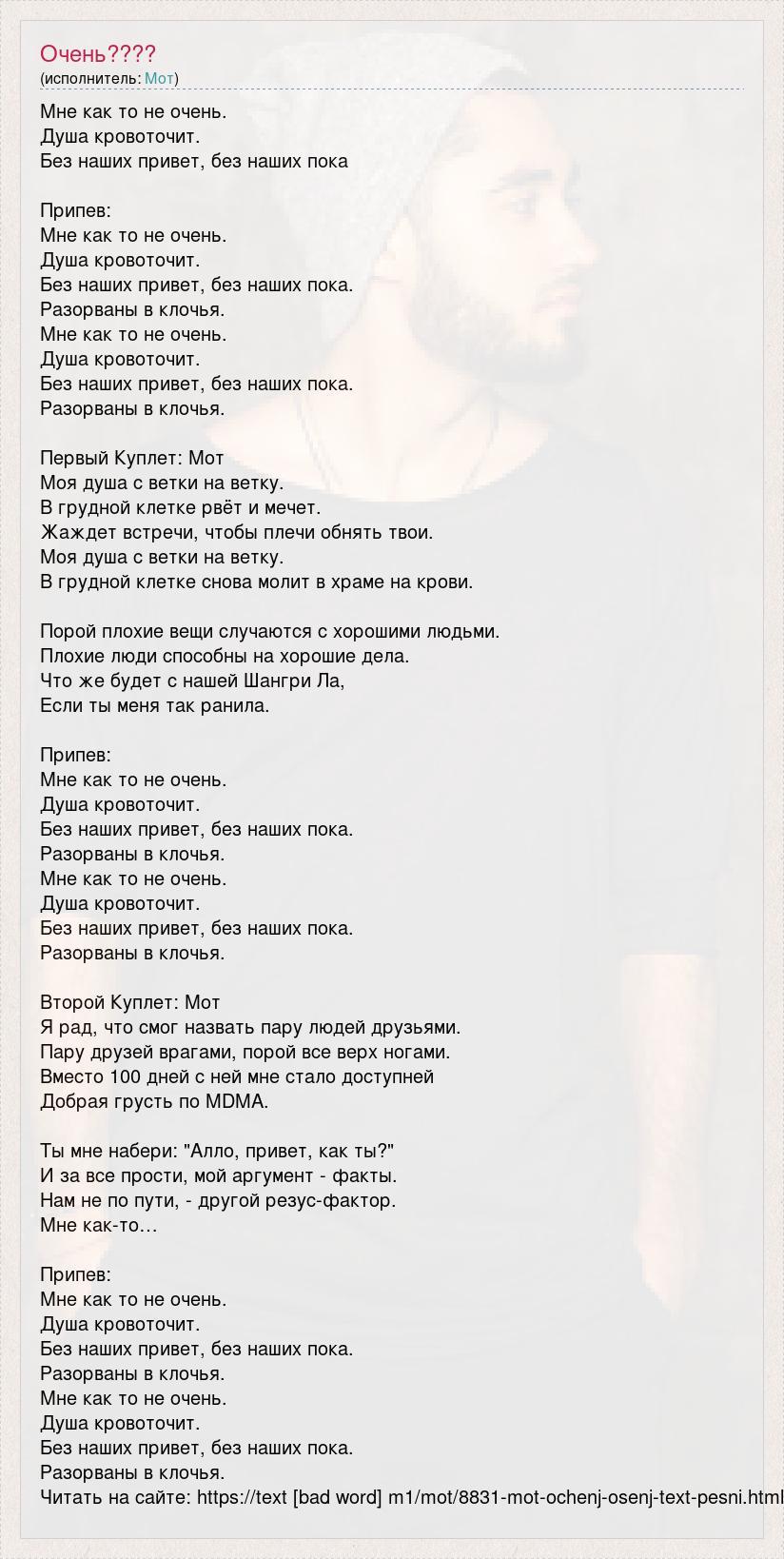 Мне как то не очень. Душа кровоточит. Без наших привет, без наших пока Припев: Мне как то не очень. Душа кровоточит. Без наших привет, без наших пока. Разорваны в клочья. Мне как то не очень. Душа кровоточит. Без наших привет, без наших пока. Разорваны в клочья. Первый Куплет: Мот Моя душа с ветки на ветку. В грудной клетке рвёт и мечет. Жаждет встречи, чтобы плечи обнять твои. Моя душа с ветки на ветку. В грудной клетке снова молит в храме на крови. Порой плохие вещи случаются с хорошими людьми. Плохие люди способны на хорошие дела. Что же будет с нашей Шангри Ла, Если ты меня так ранила. Припев: Мне как то не очень. Душа кровоточит. Без наших привет, без наших пока. Разорваны в клочья. Мне как то не очень. Душа кровоточит. Без наших привет, без наших пока. Разорваны в клочья. Второй Куплет: Мот Я рад, что смог назвать пару людей друзьями. Пару друзей врагами, порой все верх ногами. Вместо 100 дней с ней мне стало доступней Добрая грусть по MDMA. Ты мне набери: "Алло, привет, как ты?" И за все прости, мой аргумент - факты. Нам не по пути, - другой резус-фактор. Мне как-то… Припев: Мне как то не очень. Душа кровоточит. Без наших привет, без наших пока. Разорваны в клочья. Мне как то не очень. Душа кровоточит. Без наших привет, без наших пока. Разорваны в клочья. Читать на сайте: https://text [bad word] m1/mot/8831-mot-ochenj-osenj-text-pesni.html
