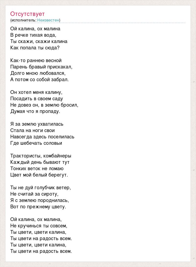 Ой калина, ох малина В речке тихая вода, Ты скажи, скажи калина Как попала ты сюда? Как-то раннею весной Парень бравый прискакал, Долго мною любовался, А потом со собой забрал. Он хотел меня калину, Посадить в своем саду Не довез он, в землю бросил, Думая что я пропаду. Я за землю ухватилась Стала на ноги свои Навсегда здесь поселилась Где шебечать соловьи Трактористы, комбайнеры Каждый день бывают тут Тонких веток не ломаю Цвет мой белый берегут. Ты не дуй голубчик ветер, Не считай за сироту, Я с землею породнилась, Вот по прежнему цвету. Ой калина, ох малина, Не кручинься ты совсем, Ты цвети, цвети калина, Ты цвети на радость всем. Ты цвети, цвети калина, Ты цвети на радость всем.