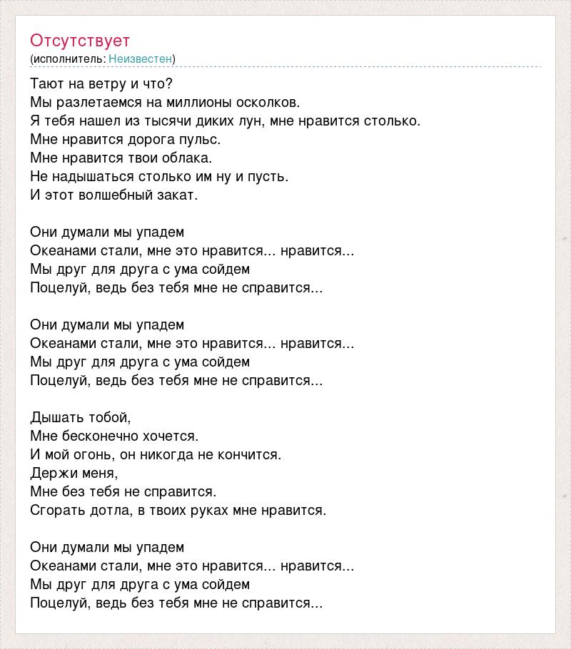 Тают на ветру и что? Мы разлетаемся на миллионы осколков. Я тебя нашел из тысячи диких лун, мне нравится столько. Мне нравится дорога пульс. Мне нравится твои облака. Не надышаться столько им ну и пусть. И этот волшебный закат. Они думали мы упадем Океанами стали, мне это нравится... нравится... Мы друг для друга с ума сойдем Поцелуй, ведь без тебя мне не справится... Они думали мы упадем Океанами стали, мне это нравится... нравится... Мы друг для друга с ума сойдем Поцелуй, ведь без тебя мне не справится... Дышать тобой, Мне бесконечно хочется. И мой огонь, он никогда не кончится. Держи меня, Мне без тебя не справится. Сгорать дотла, в твоих руках мне нравится. Они думали мы упадем Океанами стали, мне это нравится... нравится... Мы друг для друга с ума сойдем Поцелуй, ведь без тебя мне не справится...