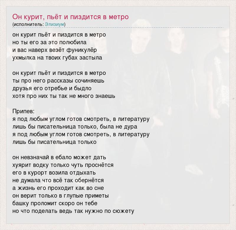 А как ты думаешь, о чем песня "он курит пьёт и пиздится в метро" ?