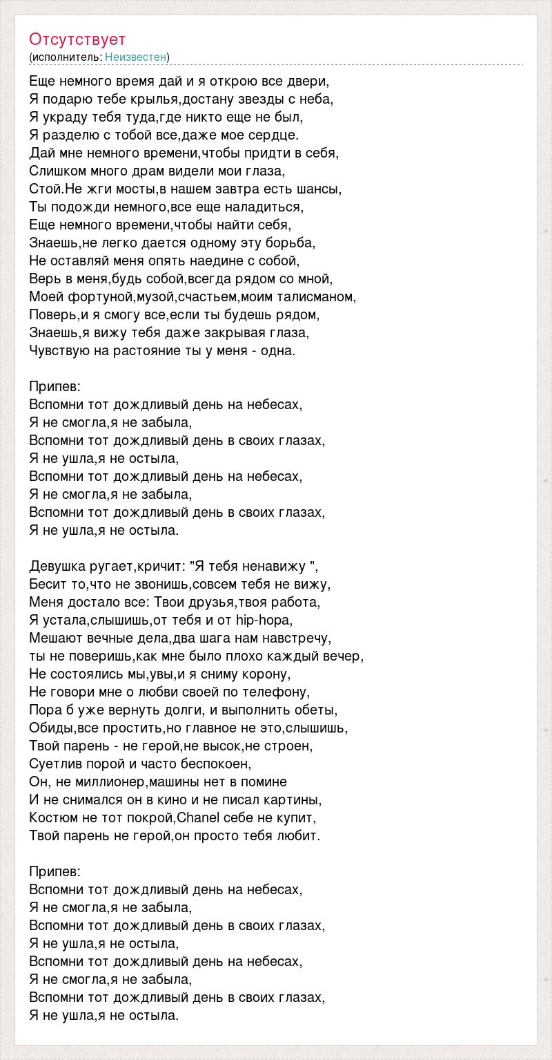Еще немного время дай и я открою все двери, Я подарю тебе крылья,достану звезды с неба, Я украду тебя туда,где никто еще не был, Я разделю с тобой все,даже мое сердце. Дай мне немного времени,чтобы придти в себя, Слишком много драм видели мои глаза, Стой.Не жги мосты,в нашем завтра есть шансы, Ты подожди немного,все еще наладиться, Еще немного времени,чтобы найти себя, Знаешь,не легко дается одному эту борьба, Не оставляй меня опять наедине с собой, Верь в меня,будь собой,всегда рядом со мной, Моей фортуной,музой,счастьем,моим талисманом, Поверь,и я смогу все,если ты будешь рядом, Знаешь,я вижу тебя даже закрывая глаза, Чувствую на растояние ты у меня - одна. Припев: Вспомни тот дождливый день на небесах, Я не смогла,я не забыла, Вспомни тот дождливый день в своих глазах, Я не ушла,я не остыла, Вспомни тот дождливый день на небесах, Я не смогла,я не забыла, Вспомни тот дождливый день в своих глазах, Я не ушла,я не остыла. Девушка ругает,кричит: "Я тебя ненавижу ", Бесит то,что не звонишь,совсем тебя не вижу, Меня достало все: Твои друзья,твоя работа, Я устала,слышишь,от тебя и от hip-hopa, Мешают вечные дела,два шага нам навстречу, ты не поверишь,как мне было плохо каждый вечер, Не состоялись мы,увы,и я сниму корону, Не говори мне о любви своей по телефону, Пора б уже вернуть долги, и выполнить обеты, Обиды,все простить,но главное не это,слышишь, Твой парень - не герой,не высок,не строен, Суетлив порой и часто беспокоен, Он, не миллионер,машины нет в помине И не снимался он в кино и не писал картины, Костюм не тот покрой,Chanel себе не купит, Твой парень не герой,он просто тебя любит. Припев: Вспомни тот дождливый день на небесах, Я не смогла,я не забыла, Вспомни тот дождливый день в своих глазах, Я не ушла,я не остыла, Вспомни тот дождливый день на небесах, Я не смогла,я не забыла, Вспомни тот дождливый день в своих глазах, Я не ушла,я не остыла.