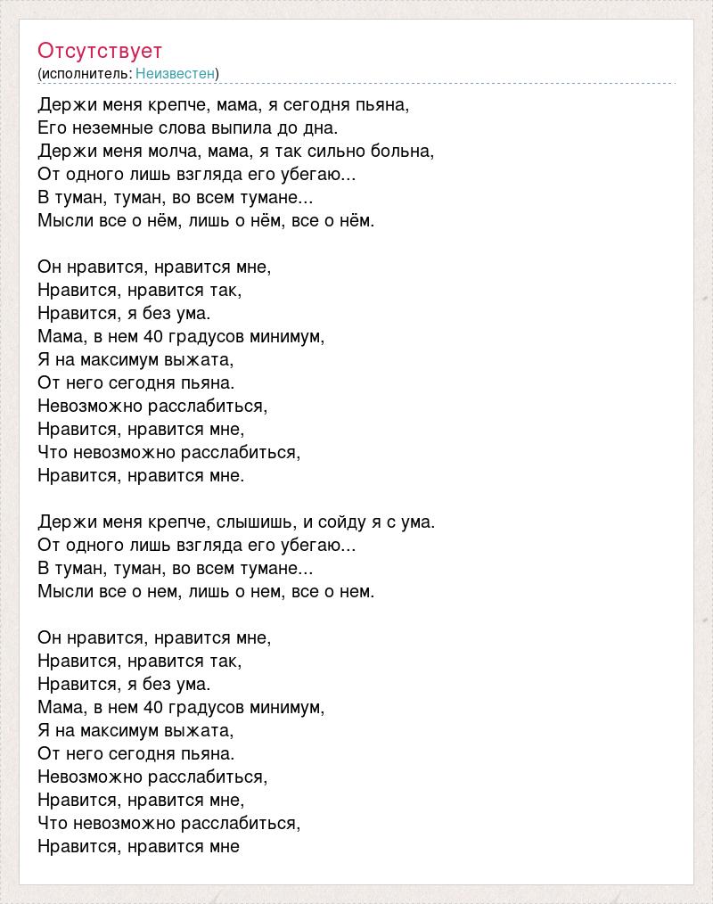 Держи меня крепче, мама, я сегодня пьяна, Его неземные слова выпила до дна. Держи меня молча, мама, я так сильно больна, От одного лишь взгляда его убегаю... В туман, туман, во всем тумане... Мысли все о нём, лишь о нём, все о нём. Он нравится, нравится мне, Нравится, нравится так, Нравится, я без ума. Мама, в нем 40 градусов минимум, Я на максимум выжата, От него сегодня пьяна. Невозможно расслабиться, Нравится, нравится мне, Что невозможно расслабиться, Нравится, нравится мне. Держи меня крепче, слышишь, и сойду я с ума. От одного лишь взгляда его убегаю... В туман, туман, во всем тумане... Мысли все о нем, лишь о нем, все о нем. Он нравится, нравится мне, Нравится, нравится так, Нравится, я без ума. Мама, в нем 40 градусов минимум, Я на максимум выжата, От него сегодня пьяна. Невозможно расслабиться, Нравится, нравится мне, Что невозможно расслабиться, Нравится, нравится мне