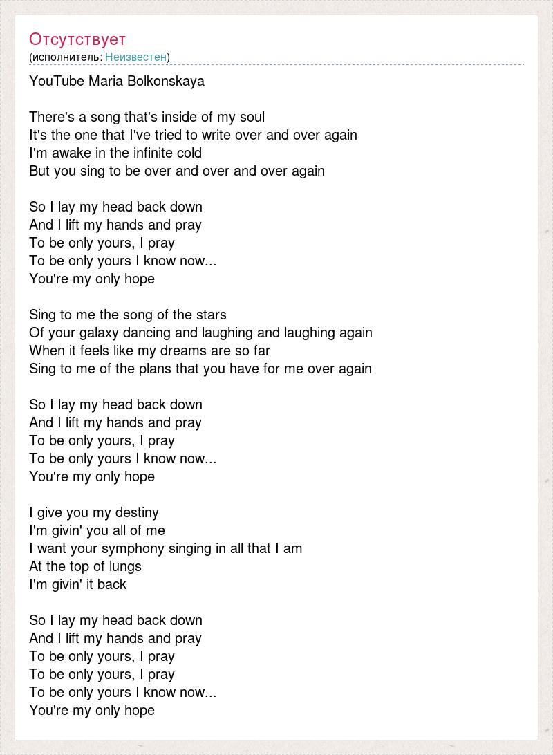YouTube Maria Bolkonskaya There's a song that's inside of my soul It's the one that I've tried to write over and over again I'm awake in the infinite cold But you sing to be over and over and over again So I lay my head back down And I lift my hands and pray To be only yours, I pray To be only yours I know now... You're my only hope Sing to me the song of the stars Of your galaxy dancing and laughing and laughing again When it feels like my dreams are so far Sing to me of the plans that you have for me over again So I lay my head back down And I lift my hands and pray To be only yours, I pray To be only yours I know now... You're my only hope I give you my destiny I'm givin' you all of me I want your symphony singing in all that I am At the top of lungs I'm givin' it back So I lay my head back down And I lift my hands and pray To be only yours, I pray To be only yours, I pray To be only yours I know now... You're my only hope