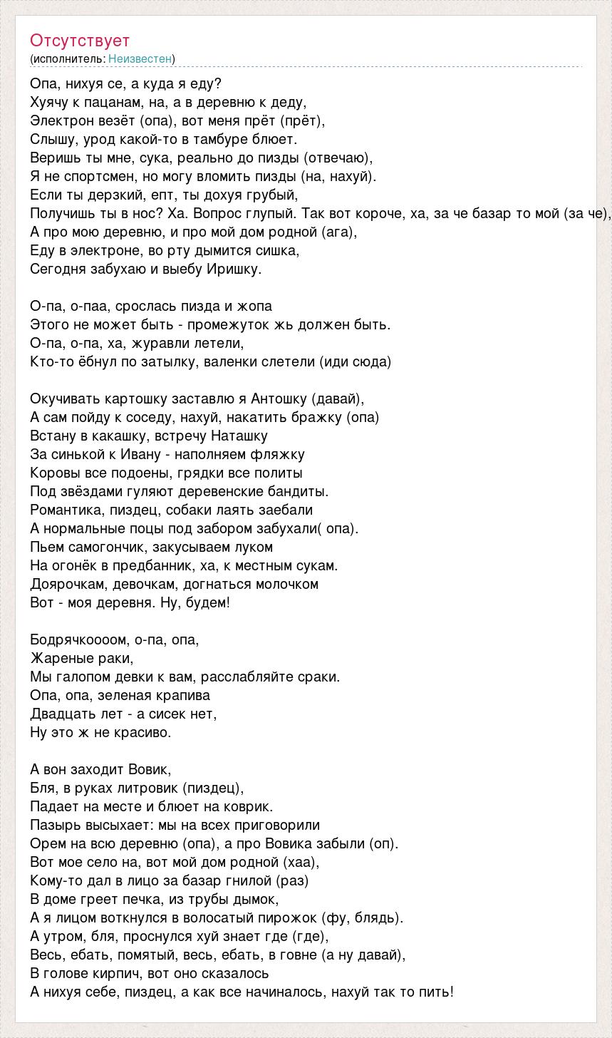 Опа, нихуя се, а куда я еду? Хуячу к пацанам, на, а в деревню к деду, Электрон везёт (опа), вот меня прёт (прёт), Слышу, урод какой-то в тамбуре блюет. Веришь ты мне, сука, реально до пизды (отвечаю), Я не спортсмен, но могу вломить пизды (на, нахуй). Если ты дерзкий, епт, ты дохуя грубый, Получишь ты в нос? Ха. Вопрос глупый. Так вот короче, ха, за че базар то мой (за че), А про мою деревню, и про мой дом родной (ага), Еду в электроне, во рту дымится сишка, Сегодня забухаю и выебу Иришку. О-па, о-паа, срослась пизда и жопа Этого не может быть - промежуток жь должен быть. О-па, о-па, ха, журавли летели, Кто-то ёбнул по затылку, валенки слетели (иди сюда) Окучивать картошку заставлю я Антошку (давай), А сам пойду к соседу, нахуй, накатить бражку (опа) Встану в какашку, встречу Наташку За синькой к Ивану - наполняем фляжку Коровы все подоены, грядки все политы Под звёздами гуляют деревенские бандиты. Романтика, пиздец, собаки лаять заебали А нормальные поцы под забором забухали( опа). Пьем самогончик, закусываем луком На огонёк в предбанник, ха, к местным сукам. Доярочкам, девочкам, догнаться молочком Вот - моя деревня. Ну, будем! Бодрячкоооом, о-па, опа, Жареные раки, Мы галопом девки к вам, расслабляйте сраки. Опа, опа, зеленая крапива Двадцать лет - а сисек нет, Ну это ж не красиво. А вон заходит Вовик, Бля, в руках литровик (пиздец), Падает на месте и блюет на коврик. Пазырь высыхает: мы на всех приговорили Орем на всю деревню (опа), а про Вовика забыли (оп). Вот мое село на, вот мой дом родной (хаа), Кому-то дал в лицо за базар гнилой (раз) В доме греет печка, из трубы дымок, А я лицом воткнулся в волосатый пирожок (фу, блядь). А утром, бля, проснулся хуй знает где (где), Весь, ебать, помятый, весь, ебать, в говне (а ну давай), В голове кирпич, вот оно сказалось А нихуя себе, пиздец, а как все начиналось, нахуй так то пить!