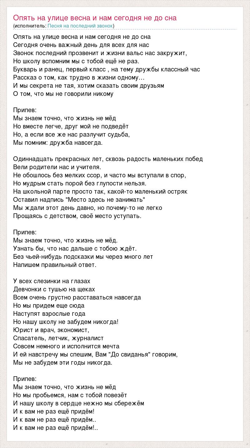 Опять на улице весна и нам сегодня не до сна Сегодня очень важный день для всех для нас Звонок последний прозвенит и жизни вальс нас закружит, Но школу вспомним мы с тобой ещё не раз. Букварь и ранец, первый класс , на тему дружбы классный час Рассказ о том, как трудно в жизни одному… И мы секрета не тая, хотим сказать своим друзьям О том, что мы не говорили никому Припев: Мы знаем точно, что жизнь не мёд Но вместе легче, друг мой не подведёт Но, а если все же нас разлучит судьба, Мы помним: дружба навсегда. Одиннадцать прекрасных лет, сквозь радость маленьких побед Вели родители нас и учителя. Не обошлось без мелких ссор, и часто мы вступали в спор, Но мудрым стать порой без глупости нельзя. На школьной парте просто так, какой-то маленький остряк Оставил надпись "Место здесь не занимать" Мы ждали этот день давно, но почему-то не легко Прощаясь с детством, своё место уступать. Припев: Мы знаем точно, что жизнь не мёд. Узнать бы, что нас дальше с тобою ждёт. Без чьей-нибудь подсказки мы через много лет Напишем правильный ответ. У всех слезинки на глазах Девчонки с тушью на щеках Всем очень грустно расставаться навсегда Но мы придем еще сюда Наступят взрослые года Но нашу школу не забудем никогда! Юрист и врач, экономист, Спасатель, летчик, журналист Совсем немного и исполнится мечта И ей навстречу мы спешим, Вам "До свиданья" говорим, Мы не забудем эти годы никогда. Припев: Мы знаем точно, что жизнь не мёд Но мы пробьемся, нам с тобой повезёт И нашу школу в сердце нежно мы сбережём И к вам не раз ещё придём! И к вам не раз ещё придём.. И к вам не раз ещё придём!..