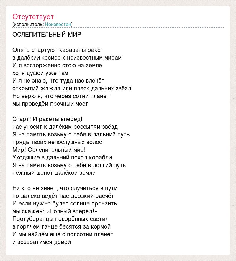 ОСЛЕПИТЕЛЬНЫЙ МИР Опять стартуют караваны ракет в далёкий космос к неизвестным мирам И я восторженно стою на земле хотя душой уже там И я не знаю, что туда нас влечёт открытий жажда или плеск дальних звёзд Но верю я, что через сотни планет мы проведём прочный мост Старт! И ракеты вперёд! нас уносит к далёким россыпям звёзд Я на память возьму о тебе в дальний путь прядь твоих непослушных волос Мир! Ослепительный мир! Уходящие в дальний поход корабли Я на память возьму о тебе в долгий путь нежный шепот далёкой земли Ни кто не знает, что случиться в пути но далеко ведёт нас дерзкий расчёт И если нужно будет солнце пронзить мы скажем: «Полный вперёд!» Протуберанцы покорённых светил в горячем танце бесятся за кормой И мы найдём ещё с полсотни планет и возвратимся домой