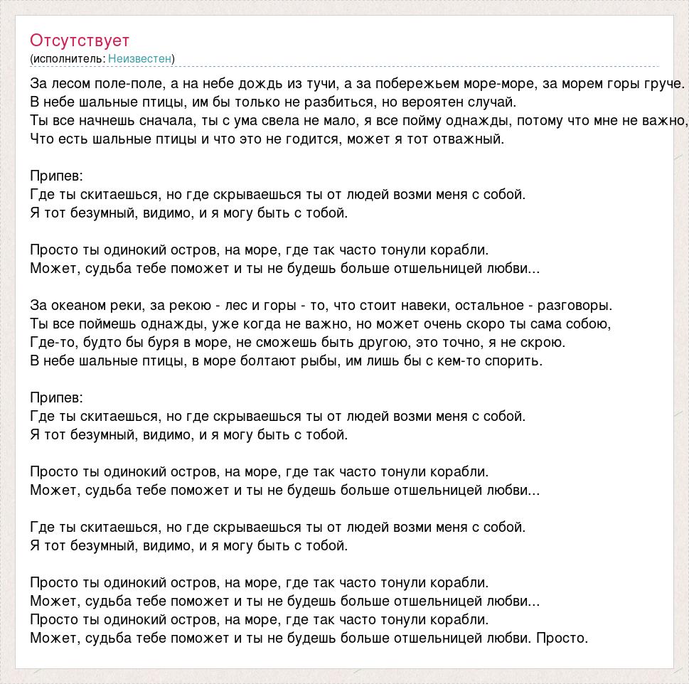 За лесом поле-поле, а на небе дождь из тучи, а за побережьем море-море, за морем горы груче. В небе шальные птицы, им бы только не разбиться, но вероятен случай. Ты все начнешь сначала, ты с ума свела не мало, я все пойму однажды, потому что мне не важно, Что есть шальные птицы и что это не годится, может я тот отважный. Припев: Где ты скитаешься, но где скрываешься ты от людей возми меня с собой. Я тот безумный, видимо, и я могу быть с тобой. Просто ты одинокий остров, на море, где так часто тонули корабли. Может, судьба тебе поможет и ты не будешь больше отшельницей любви... За океаном реки, за рекою - лес и горы - то, что стоит навеки, остальное - разговоры. Ты все поймешь однажды, уже когда не важно, но может очень скоро ты сама собою, Где-то, будто бы буря в море, не сможешь быть другою, это точно, я не скрою. В небе шальные птицы, в море болтают рыбы, им лишь бы с кем-то спорить. Припев: Где ты скитаешься, но где скрываешься ты от людей возми меня с собой. Я тот безумный, видимо, и я могу быть с тобой. Просто ты одинокий остров, на море, где так часто тонули корабли. Может, судьба тебе поможет и ты не будешь больше отшельницей любви... Где ты скитаешься, но где скрываешься ты от людей возми меня с собой. Я тот безумный, видимо, и я могу быть с тобой. Просто ты одинокий остров, на море, где так часто тонули корабли. Может, судьба тебе поможет и ты не будешь больше отшельницей любви... Просто ты одинокий остров, на море, где так часто тонули корабли. Может, судьба тебе поможет и ты не будешь больше отшельницей любви. Просто.