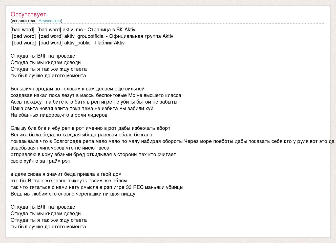 [bad word] [bad word] aktiv_mc - Страница в ВК Aktiv [bad word] [bad word] aktiv_groupofficial - Официальная группа Aktiv [bad word] [bad word] aktiv_public - Паблик Aktiv Откуда ты ВЛГ на проводе Откуда ты мы кидаем доводы Откуда ты я так же жду ответа ты был лучше до этого момента Большим городам по головам к вам делаем еще сильней создавая накал пока лезут в массы беспонтовые Мс не высшего класса Ассы покажут на бите кто батя в реп игре не убиты бытом не забыты Наша свита новая элита пока тема не избита мы забили хуй На ебанных пидоров,что в роли лидеров Слышу бла бла и ебу реп в рот именно в рот дабы избежать аборт Велика была беда,но каждая ябеда разевая ебало бежала показывала что в Волгограде репа мало мало по малу набирая обороты Через море поеботы дабы показать себя кто у руля вот это да взьёбывая глиномесов что не имеют веса отправляю в кому ебаный бред откидывая в стороны тех кто считает свою хуйню за грайм рэп в деле снова я значит беда пришла в твой дом что бы В твое же гавно тыкнуть твоим же еблом так что тягаться с нами нету смысла в рэп игре 33 REC маньяки убийцы Ведь мы любим его словно черепашки ниндзя пиццу Откуда ты ВЛГ на проводе Откуда ты мы кидаем доводы Откуда ты я так же жду ответа ты был лучше до этого момента