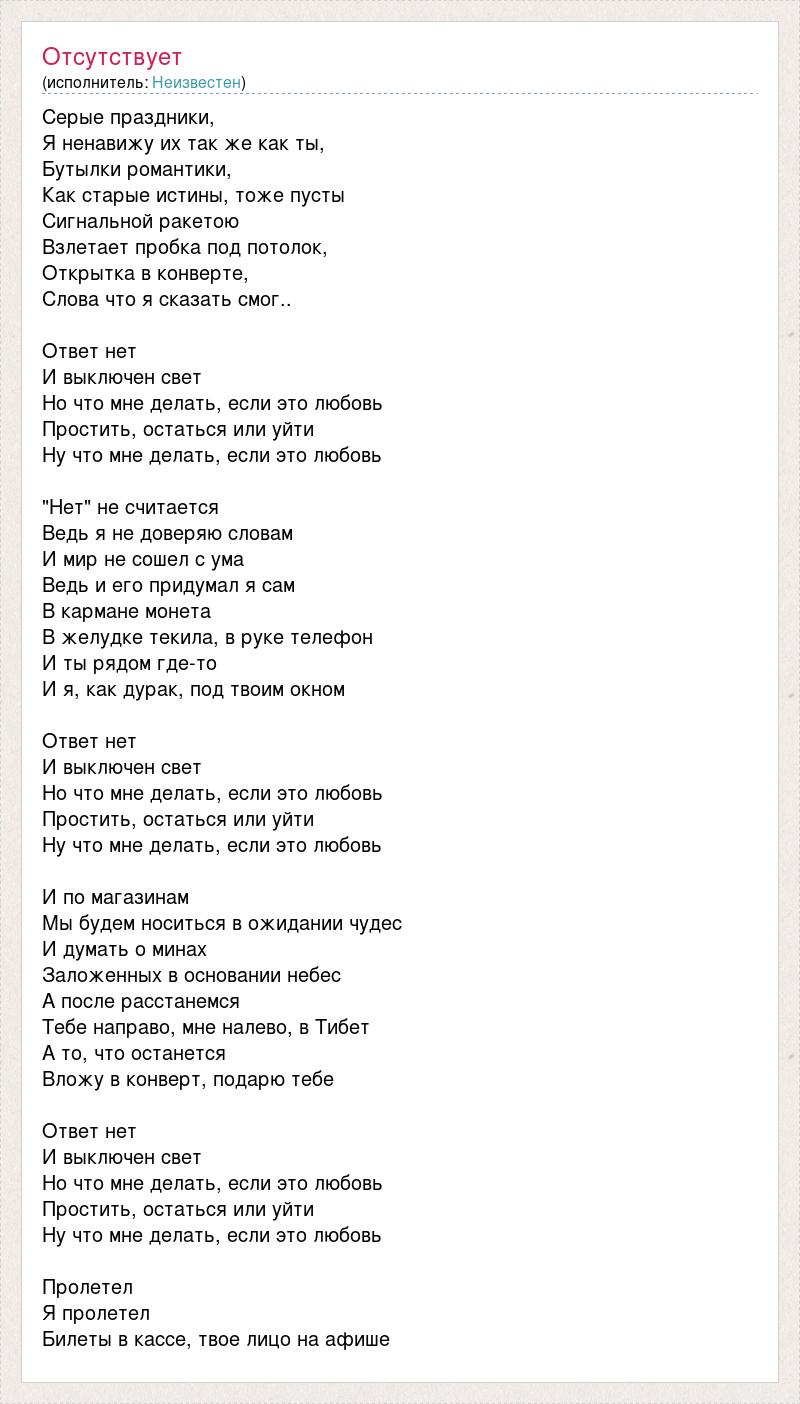 Серые праздники, Я ненавижу их так же как ты, Бутылки романтики, Как старые истины, тоже пусты Сигнальной ракетою Взлетает пробка под потолок, Открытка в конверте, Слова что я сказать смог.. Ответ нет И выключен свет Но что мне делать, если это любовь Простить, остаться или уйти Ну что мне делать, если это любовь "Нет" не считается Ведь я не доверяю словам И мир не сошел с ума Ведь и его придумал я сам В кармане монета В желудке текила, в руке телефон И ты рядом где-то И я, как дурак, под твоим окном Ответ нет И выключен свет Но что мне делать, если это любовь Простить, остаться или уйти Ну что мне делать, если это любовь И по магазинам Мы будем носиться в ожидании чудес И думать о минах Заложенных в основании небес А после расстанемся Тебе направо, мне налево, в Тибет А то, что останется Вложу в конверт, подарю тебе Ответ нет И выключен свет Но что мне делать, если это любовь Простить, остаться или уйти Ну что мне делать, если это любовь Пролетел Я пролетел Билеты в кассе, твое лицо на афише