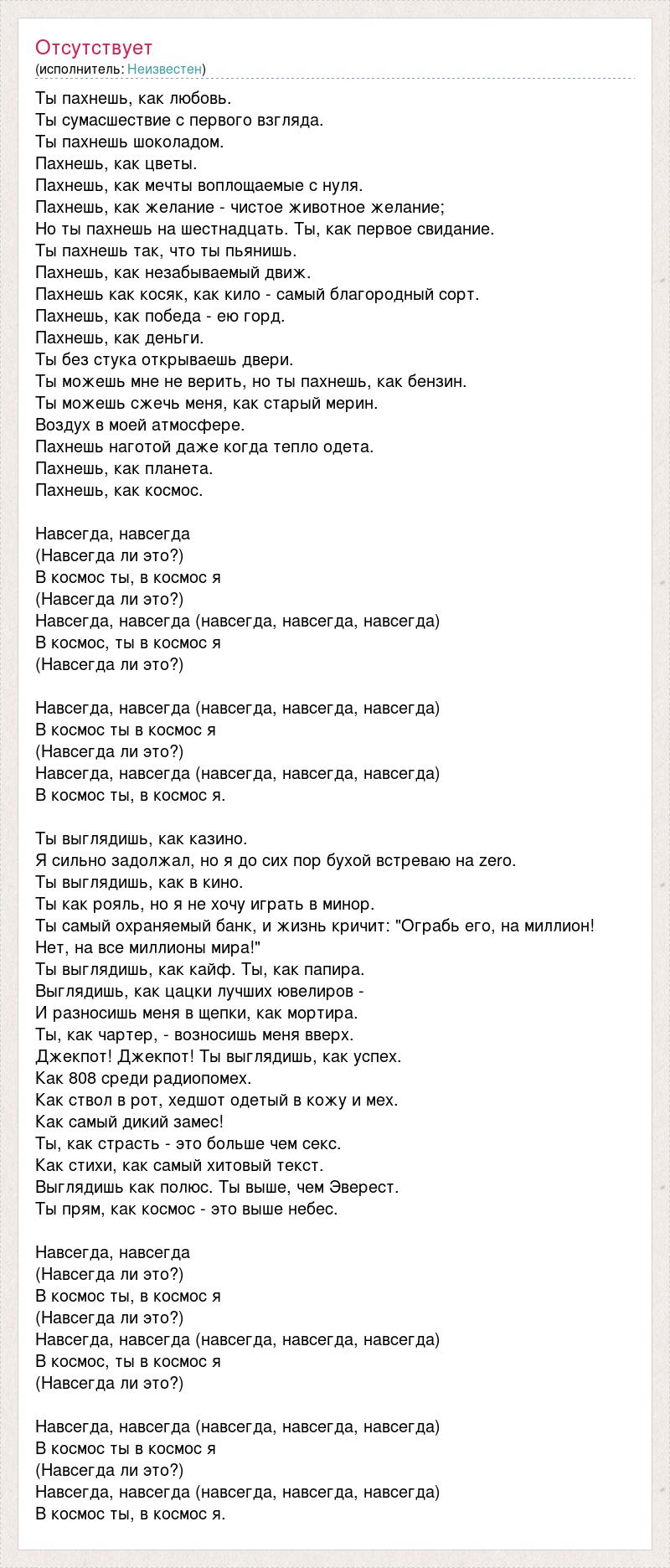 Ты пахнешь, как любовь. Ты сумасшествие с первого взгляда. Ты пахнешь шоколадом. Пахнешь, как цветы. Пахнешь, как мечты воплощаемые с нуля. Пахнешь, как желание - чистое животное желание; Но ты пахнешь на шестнадцать. Ты, как первое свидание. Ты пахнешь так, что ты пьянишь. Пахнешь, как незабываемый движ. Пахнешь как косяк, как кило - самый благородный сорт. Пахнешь, как победа - ею горд. Пахнешь, как деньги. Ты без стука открываешь двери. Ты можешь мне не верить, но ты пахнешь, как бензин. Ты можешь сжечь меня, как старый мерин. Воздух в моей атмосфере. Пахнешь наготой даже когда тепло одета. Пахнешь, как планета. Пахнешь, как космос. Навсегда, навсегда (Навсегда ли это?) В космос ты, в космос я (Навсегда ли это?) Навсегда, навсегда (навсегда, навсегда, навсегда) В космос, ты в космос я (Навсегда ли это?) Навсегда, навсегда (навсегда, навсегда, навсегда) В космос ты в космос я (Навсегда ли это?) Навсегда, навсегда (навсегда, навсегда, навсегда) В космос ты, в космос я. Ты выглядишь, как казино. Я сильно задолжал, но я до сих пор бухой встреваю на zero. Ты выглядишь, как в кино. Ты как рояль, но я не хочу играть в минор. Ты самый охраняемый банк, и жизнь кричит: "Ограбь его, на миллион! Нет, на все миллионы мира!" Ты выглядишь, как кайф. Ты, как папира. Выглядишь, как цацки лучших ювелиров - И разносишь меня в щепки, как мортира. Ты, как чартер, - возносишь меня вверх. Джекпот! Джекпот! Ты выглядишь, как успех. Как 808 среди радиопомех. Как ствол в рот, хедшот одетый в кожу и мех. Как самый дикий замес! Ты, как страсть - это больше чем секс. Как стихи, как самый хитовый текст. Выглядишь как полюс. Ты выше, чем Эверест. Ты прям, как космос - это выше небес. Навсегда, навсегда (Навсегда ли это?) В космос ты, в космос я (Навсегда ли это?) Навсегда, навсегда (навсегда, навсегда, навсегда) В космос, ты в космос я (Навсегда ли это?) Навсегда, навсегда (навсегда, навсегда, навсегда) В космос ты в космос я (Навсегда ли это?) Навсегда, навсегда (навсегда, навсегда, навсегда) В космос ты, в космос я.