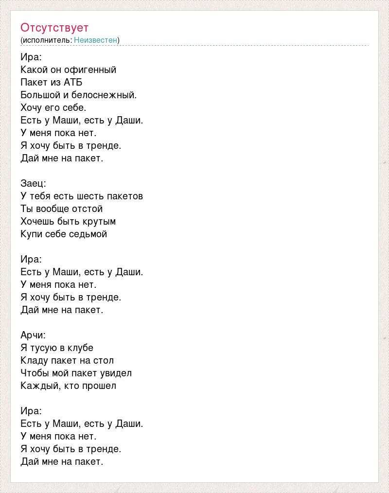 Ира: Какой он офигенный Пакет из АТБ Большой и белоснежный. Хочу его себе. Есть у Маши, есть у Даши. У меня пока нет. Я хочу быть в тренде. Дай мне на пакет. Заец: У тебя есть шесть пакетов Ты вообще отстой Хочешь быть крутым Купи себе седьмой Ира: Есть у Маши, есть у Даши. У меня пока нет. Я хочу быть в тренде. Дай мне на пакет. Арчи: Я тусую в клубе Кладу пакет на стол Чтобы мой пакет увидел Каждый, кто прошел Ира: Есть у Маши, есть у Даши. У меня пока нет. Я хочу быть в тренде. Дай мне на пакет.