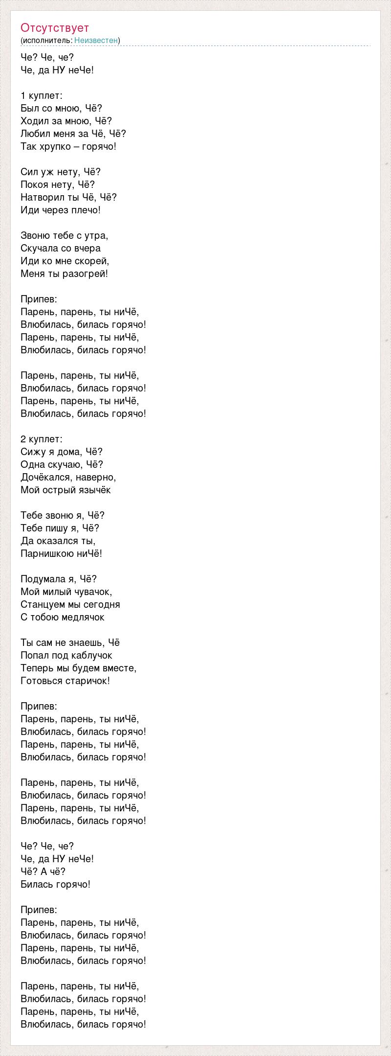 Че? Че, че? Че, да НУ неЧе! 1 куплет: Был со мною, Чё? Ходил за мною, Чё? Любил меня за Чё, Чё? Так хрупко – горячо! Сил уж нету, Чё? Покоя нету, Чё? Натворил ты Чё, Чё? Иди через плечо! Звоню тебе с утра, Скучала со вчера Иди ко мне скорей, Меня ты разогрей! Припев: Парень, парень, ты ниЧё, Влюбилась, билась горячо! Парень, парень, ты ниЧё, Влюбилась, билась горячо! Парень, парень, ты ниЧё, Влюбилась, билась горячо! Парень, парень, ты ниЧё, Влюбилась, билась горячо! 2 куплет: Сижу я дома, Чё? Одна скучаю, Чё? Дочёкался, наверно, Мой острый язычёк Тебе звоню я, Чё? Тебе пишу я, Чё? Да оказался ты, Парнишкою ниЧё! Подумала я, Чё? Мой милый чувачок, Станцуем мы сегодня С тобою медлячок Ты сам не знаешь, Чё Попал под каблучок Теперь мы будем вместе, Готовься старичок! Припев: Парень, парень, ты ниЧё, Влюбилась, билась горячо! Парень, парень, ты ниЧё, Влюбилась, билась горячо! Парень, парень, ты ниЧё, Влюбилась, билась горячо! Парень, парень, ты ниЧё, Влюбилась, билась горячо! Че? Че, че? Че, да НУ неЧе! Чё? А чё? Билась горячо! Припев: Парень, парень, ты ниЧё, Влюбилась, билась горячо! Парень, парень, ты ниЧё, Влюбилась, билась горячо! Парень, парень, ты ниЧё, Влюбилась, билась горячо! Парень, парень, ты ниЧё, Влюбилась, билась горячо!