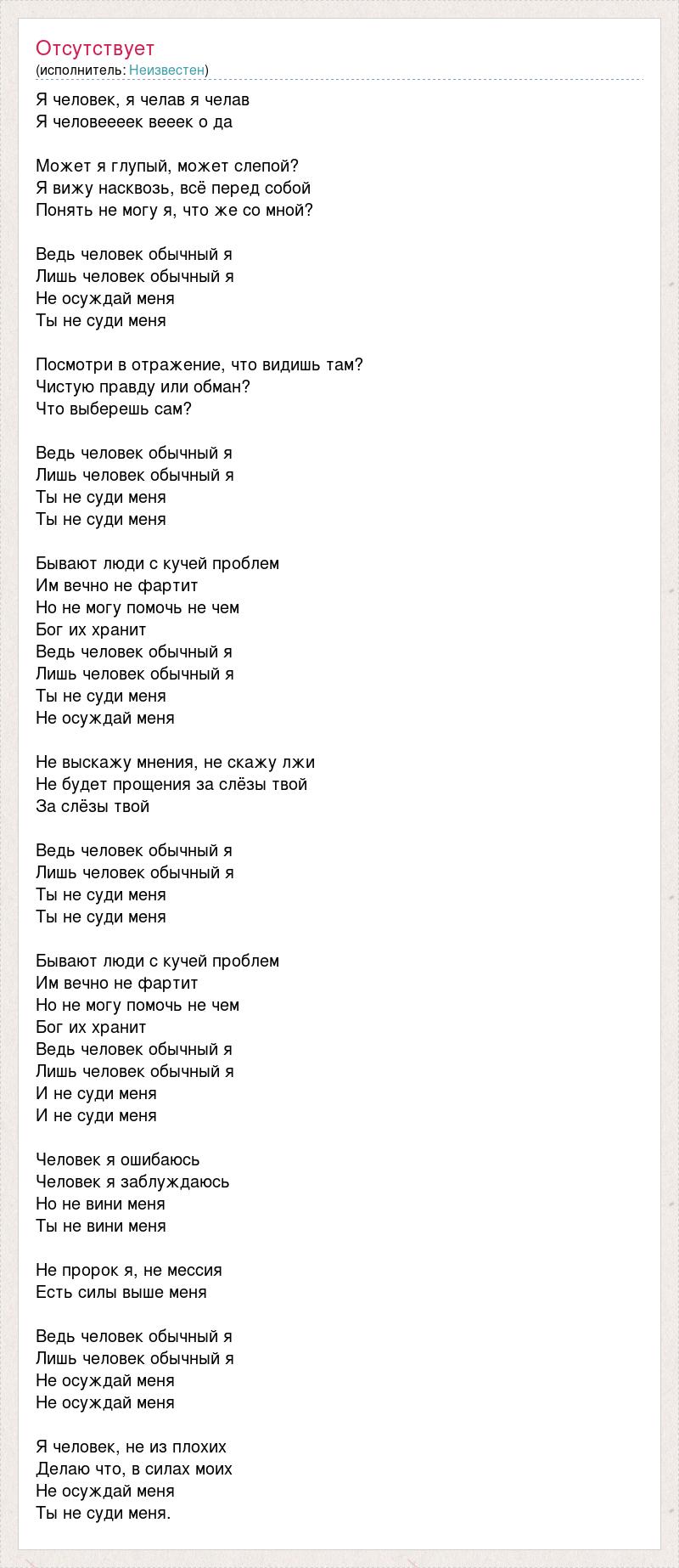 Я человек, я челав я челав Я человеееек вееек о да Может я глупый, может слепой? Я вижу насквозь, всё перед собой Понять не могу я, что же со мной? Ведь человек обычный я Лишь человек обычный я Не осуждай меня Ты не суди меня Посмотри в отражение, что видишь там? Чистую правду или обман? Что выберешь сам? Ведь человек обычный я Лишь человек обычный я Ты не суди меня Ты не суди меня Бывают люди с кучей проблем Им вечно не фартит Но не могу помочь не чем Бог их хранит Ведь человек обычный я Лишь человек обычный я Ты не суди меня Не осуждай меня Не выскажу мнения, не скажу лжи Не будет прощения за слёзы твой За слёзы твой Ведь человек обычный я Лишь человек обычный я Ты не суди меня Ты не суди меня Бывают люди с кучей проблем Им вечно не фартит Но не могу помочь не чем Бог их хранит Ведь человек обычный я Лишь человек обычный я И не суди меня И не суди меня Человек я ошибаюсь Человек я заблуждаюсь Но не вини меня Ты не вини меня Не пророк я, не мессия Есть силы выше меня Ведь человек обычный я Лишь человек обычный я Не осуждай меня Не осуждай меня Я человек, не из плохих Делаю что, в силах моих Не осуждай меня Ты не суди меня.