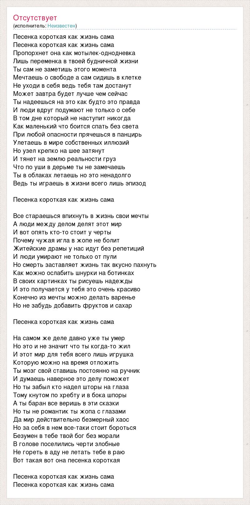 Песенка короткая как жизнь сама Песенка короткая как жизнь сама Пропорхнет она как мотылек-однодневка Лишь переменка в твоей будничной жизни Ты сам не заметишь этого момента Мечтаешь о свободе а сам сидишь в клетке Не уходи в себя ведь тебя там достанут Может завтра будет лучше чем сейчас Ты надеешься на это как будто это правда И люди вдруг подумают не только о себе В том дне который не наступит никогда Как маленький что боится спать без света При любой опасности прячешься в панцирь Улетаешь в мире собственных иллюзий Но узел крепко на шее затянут И тянет на землю реальности груз Что по уши в дерьме ты не замечаешь Ты в облаках летаешь но это ненадолго Ведь ты играешь в жизни всего лишь эпизод Песенка короткая как жизнь сама Все стараешься впихнуть в жизнь свои мечты А люди между делом делят этот мир И вот опять кто-то стоит у черты Почему чужая игла в жопе не болит Житейские драмы у нас идут без репетиций И люди умирают не только от пули Но смерть заставляет жизнь так вкусно пахнуть Как можно ослабить шнурки на ботинках В своих картинках ты рисуешь надежды И это получается у тебя это очень красиво Конечно из мечты можно делать варенье Но не забудь добавить фруктов и сахар Песенка короткая как жизнь сама На самом же деле давно уже ты умер Но это и не значит что ты когда-то жил И этот мир для тебя всего лишь игрушка Которую можно на время отложить Ты мозг свой ставишь постоянно на ручник И думаешь наверное это делу поможет Но ты забыл кто надел шторы на глаза Тому кнутом по хребту и в бока шпоры А ты баран все веришь в эти сказки Но ты не романтик ты жопа с глазами Да мир действительно безмерный хаос Но за себя в нем все-таки стоит бороться Безумен в тебе твой бог без морали В голове поселились черти злобные Не гореть в аду не летать тебе в раю Вот такая вот она песенка короткая Песенка короткая как жизнь сама Песенка короткая как жизнь сама