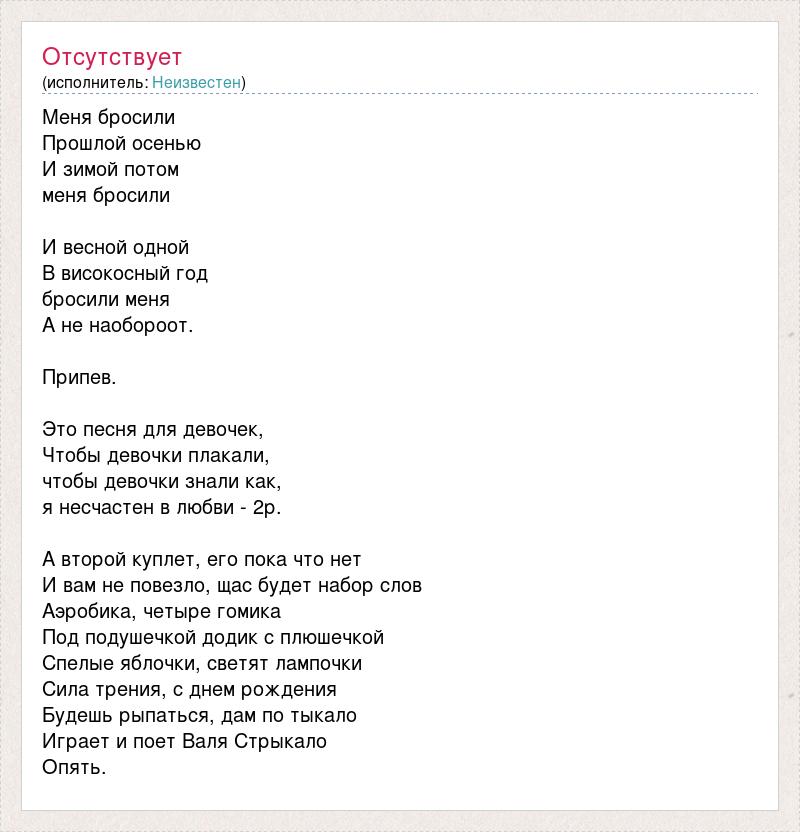 Меня бросили Прошлой осенью И зимой потом меня бросили И весной одной В високосный год бросили меня А не наобороот. Припев. Это песня для девочек, Чтобы девочки плакали, чтобы девочки знали как, я несчастен в любви - 2р. А второй куплет, его пока что нет И вам не повезло, щас будет набор слов Аэробика, четыре гомика Под подушечкой додик с плюшечкой Спелые яблочки, светят лампочки Сила трения, с днем рождения Будешь рыпаться, дам по тыкало Играет и поет Валя Стрыкало Опять.