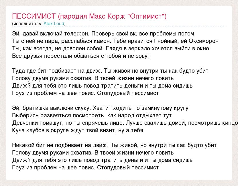 Эй, давай включай телефон. Проверь свой вк, все проблемы потом Ты с ней не пара, расслабься камон. Тебе нравится Гнойный, ей Оксиморон Ты, как всегда, не доволен собой. Глядя в зеркало хочется выйти в окно Все друзья перестали общаться с тобой и не зовут Туда где бит подбивает на движ. Ты живой но внутри ты как будто убит Голову двумя руками схватив. В твоей жизни нечего ловить Движ? для тебя это лишь повод тратить деньги и ты дома сидишь Груз из проблем на шее повис. Стопудовый пессимист Эй, братишка выключи скуку. Хватит ходить по замкнутому кругу Выберись развеяться посмотреть, как народ отдыхает тут Девченки помашут, но ты спрячешь лицо. Лучше свалишь домой, посмотришь кинцо Куча клубов в округе ждут твой визит, ну а тебя Никакой бит не подбивает на движ. Ты живой, но внутри ты как будто убит Голову двумя руками схватив. В твоей жизни нечего ловить Движ? для тебя это лишь повод тратить деньги и ты дома сидишь Груз из проблем на шее повис. Стопудовый пессимист