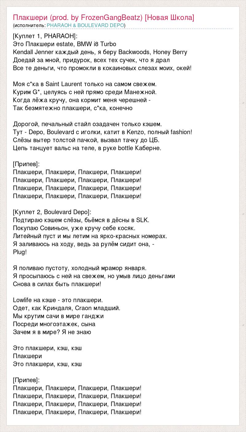 [Куплет 1, PHARAOH]: Это Плакшери estate, BMW i8 Turbo Kendall Jenner каждый день, я беру Backwoods, Honey Berry Доедай за мной, придурок, всех тех сучек, что я драл Все те деньги, что промокли в кокаиновых слезах моих, окей! Моя с*ка в Saint Laurent только на самом свежем. Курим G*, целуясь с ней прямо среди Манежной. Когда лёжа кручу, она кормит меня черешней - Так безмятежно плакшери, с*ка, конечно Дорогой, печальный стайл озадачен только кэшем. Тут - Depo, Boulevard с иголки, катит в Kenzo, полный fashion! Слёзы вытер толстой пачкой, вызвал тачку до ЦБ. Цепь танцует вальс на теле, в руке bottle Каберне. [Припев]: Плакшери, Плакшери, Плакшери, Плакшери! Плакшери, Плакшери, Плакшери, Плакшери! Плакшери, Плакшери, Плакшери, Плакшери! Плакшери, Плакшери, Плакшери, Плакшери! [Куплет 2, Boulevard Depo]: Подтираю кэшем слёзы, бьёмся в дёсны в SLK. Покупаю Совиньон, уже кручу себе косяк. Литейный пуст и мы летим на ярко-красных номерах. Я заливаюсь на ходу, ведь за рулём сидит она, - Plug! Я поливаю пустоту, холодный мрамор января. Я просыпаюсь с ней на свежем, но умыв лицо деньгами Снова в силах быть плакшери! Lowlife на кэше - это плакшери. Одет, как Криндаля, Craon младший. Мы крутим сачи в мире ганджи Посреди многоэтажек, сына Зачем я в мире? Я не знаю Это плакшери, кэш, кэш Плакшери Это плакшери, кэш, кэш [Припев]: Плакшери, Плакшери, Плакшери, Плакшери! Плакшери, Плакшери, Плакшери, Плакшери! Плакшери, Плакшери, Плакшери, Плакшери! Плакшери, Плакшери, Плакшери, Плакшери!