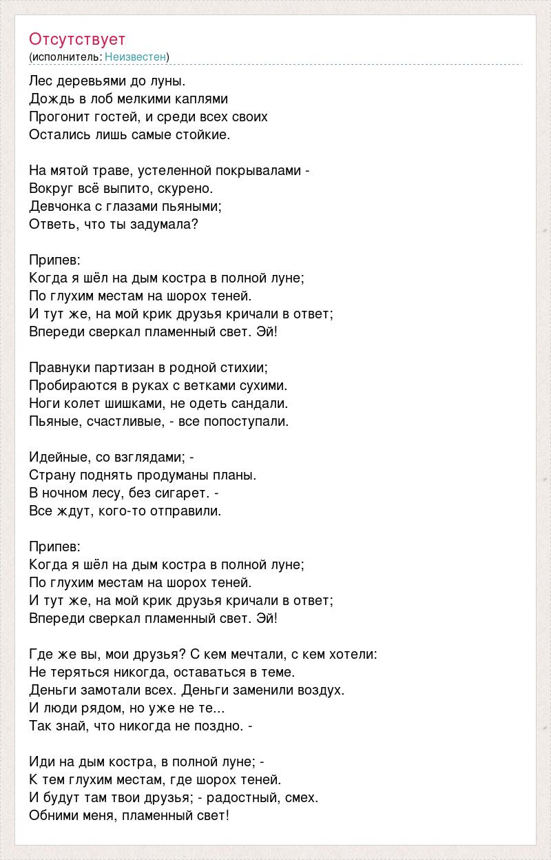 Лес деревьями до луны. Дождь в лоб мелкими каплями Прогонит гостей, и среди всех своих Остались лишь самые стойкие. На мятой траве, устеленной покрывалами - Вокруг всё выпито, скурено. Девчонка с глазами пьяными; Ответь, что ты задумала? Припев: Когда я шёл на дым костра в полной луне; По глухим местам на шорох теней. И тут же, на мой крик друзья кричали в ответ; Впереди сверкал пламенный свет. Эй! Правнуки партизан в родной стихии; Пробираются в руках с ветками сухими. Ноги колет шишками, не одеть сандали. Пьяные, счастливые, - все попоступали. Идейные, со взглядами; - Страну поднять продуманы планы. В ночном лесу, без сигарет. - Все ждут, кого-то отправили. Припев: Когда я шёл на дым костра в полной луне; По глухим местам на шорох теней. И тут же, на мой крик друзья кричали в ответ; Впереди сверкал пламенный свет. Эй! Где же вы, мои друзья? С кем мечтали, с кем хотели: Не теряться никогда, оставаться в теме. Деньги замотали всех. Деньги заменили воздух. И люди рядом, но уже не те... Так знай, что никогда не поздно. - Иди на дым костра, в полной луне; - К тем глухим местам, где шорох теней. И будут там твои друзья; - радостный, смех. Обними меня, пламенный свет!