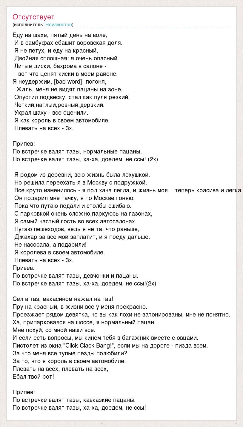 Еду на шахе, пятый день на воле, И в самбуфах ебашит воровская доля. Я не петух, и еду на красный, Двойная сплошная: я очень опасный. Литые диски, бахрома в салоне - - вот что ценят киски в моем районе. Я неудержим, [bad word] погоня, Жаль, меня не видят пацаны на зоне. Опустил подвеску, стал как пуля резкий, Четкий,наглый,ровный,дерзкий. Украл шаху - все оценили. Я как король в своем автомобиле. Плевать на всех - 3х. Припев: По встречке валят тазы, нормальные пацаны. По встречке валят тазы, ха-ха, доедем, не ссы! (2х) Я родом из деревни, всю жизнь была лохушкой. Но решила переехать я в Москву с подружкой. Все круто изменилось - я под хача легла, и жизнь моя теперь красива и легка. Он подарил мне тачку, я по Москве гоняю, Пока что путаю педали и столбы сшибаю. С парковкой очень сложно,паркуюсь на газонах, Я самый частый гость во всех автосалонах. Пугаю пешеходов, ведь я не та, что раньше, Джахар за все мой заплатит, и я поеду дальше. Не насосала, а подарили! Я королева в своем автомобиле. Плевать на всех - 3х. Привев: По встречке валят тазы, девчонки и пацаны. По встречке валят тазы, ха-ха, доедем, не ссы!(2х) Сел в таз, макасином нажал на газ! Пру на красный, в жизни все у меня прекрасно. Проезжает рядом девятка, чо вы как лохи не затонированы, мне не понятно. Ха, припарковался на шоссе, я нормальный пацан, Мне похуй, со мной наши все. И если есть вопросы, мы кинем тебя в багажник вместе с овцами. Пистолет из окна "Click Clack Bang!", если мы на дороге - пизда всем. За что меня все тупые пезды полюбили? За то, что я король в своем автомобиле. Плевать на всех, плевать на всех, Ебал твой рот! Припев: По встречке валят тазы, кавказкие пацаны. По встречке валят тазы, ха-ха, доедем, не ссы!