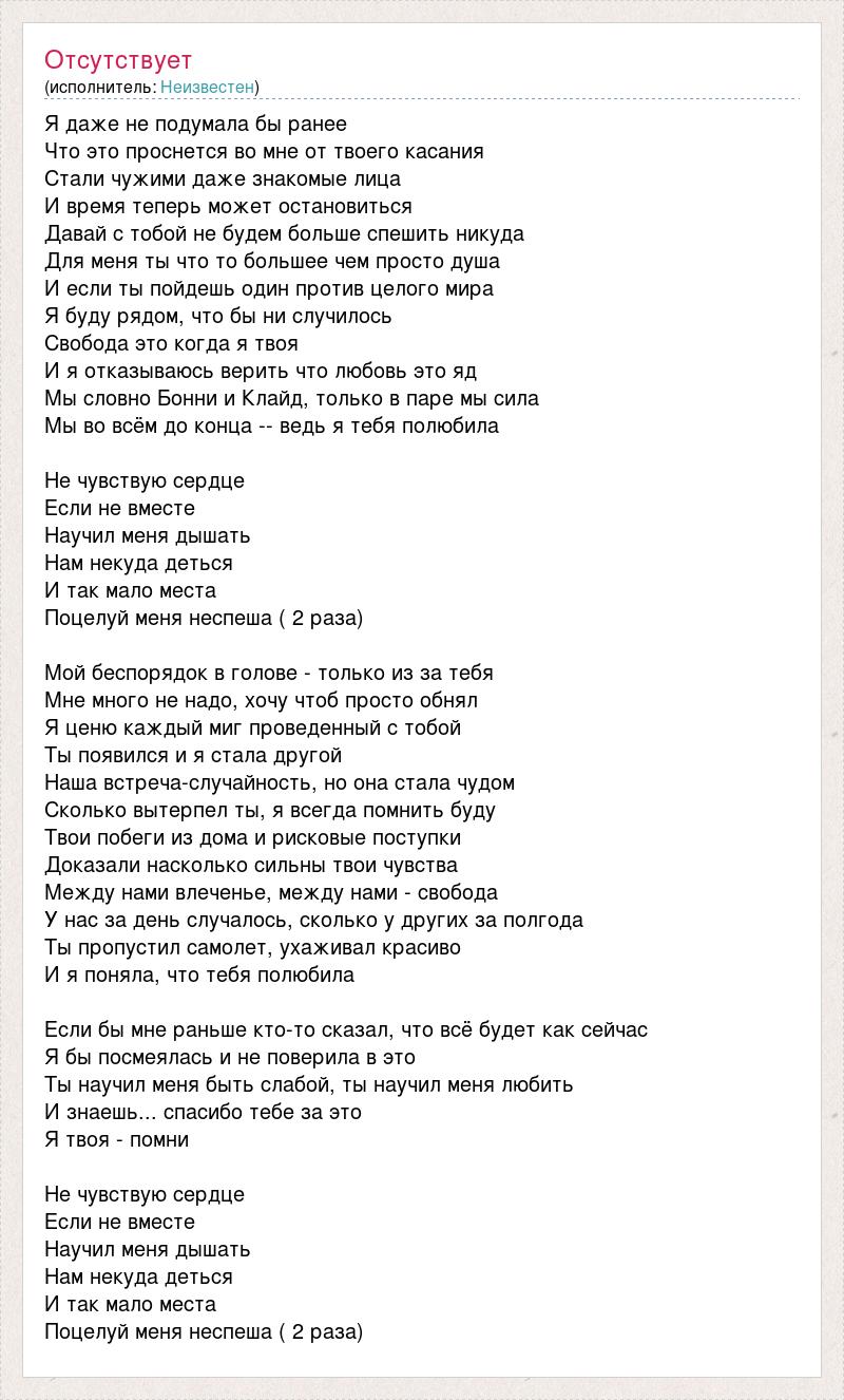 Я даже не подумала бы ранее Что это проснется во мне от твоего касания Стали чужими даже знакомые лица И время теперь может остановиться Давай с тобой не будем больше спешить никуда Для меня ты что то большее чем просто душа И если ты пойдешь один против целого мира Я буду рядом, что бы ни случилось Свобода это когда я твоя И я отказываюсь верить что любовь это яд Мы словно Бонни и Клайд, только в паре мы сила Мы во всём до конца -- ведь я тебя полюбила Не чувствую сердце Если не вместе Научил меня дышать Нам некуда деться И так мало места Поцелуй меня неспеша ( 2 раза) Мой беспорядок в голове - только из за тебя Мне много не надо, хочу чтоб просто обнял Я ценю каждый миг проведенный с тобой Ты появился и я стала другой Наша встреча-случайность, но она стала чудом Сколько вытерпел ты, я всегда помнить буду Твои побеги из дома и рисковые поступки Доказали насколько сильны твои чувства Между нами влеченье, между нами - свобода У нас за день случалось, сколько у других за полгода Ты пропустил самолет, ухаживал красиво И я поняла, что тебя полюбила Если бы мне раньше кто-то сказал, что всё будет как сейчас Я бы посмеялась и не поверила в это Ты научил меня быть слабой, ты научил меня любить И знаешь... спасибо тебе за это Я твоя - помни Не чувствую сердце Если не вместе Научил меня дышать Нам некуда деться И так мало места Поцелуй меня неспеша ( 2 раза)