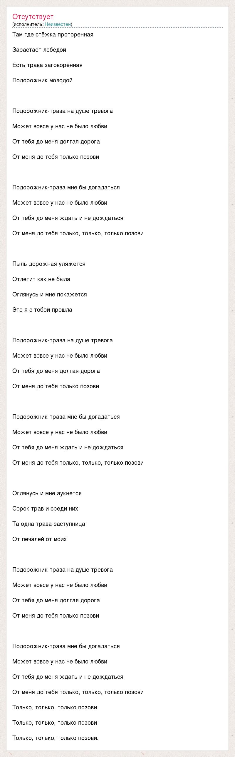Там где стёжка проторенная Зарастает лебедой Есть трава заговорённая Подорожник молодой Подорожник-трава на душе тревога Может вовсе у нас не было любви От тебя до меня долгая дорога От меня до тебя только позови Подорожник-трава мне бы догадаться Может вовсе у нас не было любви От тебя до меня ждать и не дождаться От меня до тебя только, только, только позови Пыль дорожная уляжется Отлетит как не была Оглянусь и мне покажется Это я с тобой прошла Подорожник-трава на душе тревога Может вовсе у нас не было любви От тебя до меня долгая дорога От меня до тебя только позови Подорожник-трава мне бы догадаться Может вовсе у нас не было любви От тебя до меня ждать и не дождаться От меня до тебя только, только, только позови Оглянусь и мне аукнется Сорок трав и среди них Та одна трава-заступница От печалей от моих Подорожник-трава на душе тревога Может вовсе у нас не было любви От тебя до меня долгая дорога От меня до тебя только позови Подорожник-трава мне бы догадаться Может вовсе у нас не было любви От тебя до меня ждать и не дождаться От меня до тебя только, только, только позови Только, только, только позови Только, только, только позови Только, только, только позови.