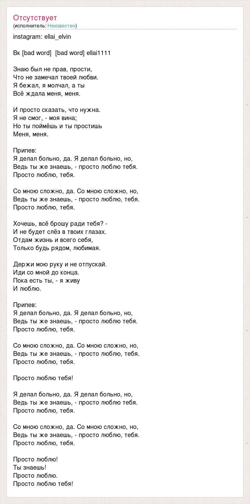 instagram: ellai_elvin Вк [bad word] [bad word] ellai1111 Знаю был не прав, прости, Что не замечал твоей любви. Я бежал, я молчал, а ты Всё ждала меня, меня. И просто сказать, что нужна. Я не смог, - моя вина; Но ты поймёшь и ты простишь Меня, меня. Припев: Я делал больно, да. Я делал больно, но, Ведь ты же знаешь, - просто люблю тебя. Просто люблю, тебя. Со мною сложно, да. Со мною сложно, но, Ведь ты же знаешь, - просто люблю, тебя. Просто люблю, тебя. Хочешь, всё брошу ради тебя? - И не будет слёз в твоих глазах. Отдам жизнь и всего себя, Только будь рядом, любимая. Держи мою руку и не отпускай. Иди со мной до конца. Пока есть ты, - я живу И люблю. Припев: Я делал больно, да. Я делал больно, но, Ведь ты же знаешь, - просто люблю тебя. Просто люблю, тебя. Со мною сложно, да. Со мною сложно, но, Ведь ты же знаешь, - просто люблю, тебя. Просто люблю, тебя. Просто люблю тебя! Я делал больно, да. Я делал больно, но, Ведь ты же знаешь, - просто люблю тебя. Просто люблю, тебя. Со мною сложно, да. Со мною сложно, но, Ведь ты же знаешь, - просто люблю, тебя. Просто люблю, тебя. Просто люблю! Ты знаешь! Просто люблю. Просто люблю тебя!