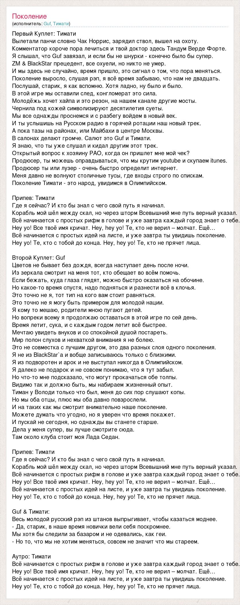 Первый Куплет: Тимати Вылетали панчи словно Чак Норрис, зарядил ствол, вышел на охоту. Комментатор короче пора лечиться и твой доктор здесь Тандум Верде Форте. Я слышал, что Guf завязал, и если бы не шнурки - конечно было бы супер. ZM & BlackStar прецедент, все охуели, но никто не умер. И мы здесь не случайно, время пришло, это сигнал о том, что пора меняться. Поколение выросло, слушая рэп, я всё время забываю, что нам не двадцать. Послушай, старик, я как вспомню. Хотя ладно, ну было и было. В этой игре мы оставили след, конгломерат это сила. Молодёжь хочет хайпа и это резон, на нашем канале другие мосты. Чернила под кожей символизируют десятилетия суеты. Мы все однажды проснемся и с разбегу войдем в новый век. И ты услышишь на Русском радио в горячей ротации наш новый трек. А пока тазы на районах, или Майбахи в центре Москвы. В салонах делают громче. Салют это Guf и Тимати. Я знаю, что ты уже слушал и кидал другим этот трек. Открытый вопрос к хозяину РАО, когда он пришлет мне мой чек? Продюсер, ты можешь оправдываться, что мы крутим youtube и скупаем itunes. Продюсер ты или лузер - очень быстро определит интернет. Меня давно не волнуют столичные тусы, где входы строго по спискам. Поколение Тимати - это народ, увидимся в Олимпийском. Припев: Тимати Где я сейчас? И кто бы знал с чего свой путь я начинал. Корабль мой шёл между скал, но через шторм Всевышний мне путь верный указал. Всё начинается с простых рифм в голове и уже завтра каждый город знает о тебе. Hey yo! Все твоё имя кричат. Hey, hey yo! Те, кто не верил – молчат. Ещё… Всё начинается с простых идей на листе, и уже завтра ты увидишь поколение. Hey yo! Те, кто с тобой до конца. Hey, hey yo! Те, кто не прячет лица. Второй Куплет: Guf Цветов не бывает без дождя, всегда наступает день после ночи. Из зеркала смотрит на меня тот, кто обещает во всём помочь. Если бежать, куда глаза глядят, можно быстро оказаться на обочине. Но какое-то время спустя, надо подняться и разнести всё в клочья. Это точно не я, тот тип на кого вам стоит равняться. Это точно не я могу быть примером для молодой нации. Я кому то мешаю, родители мною пугают детей. Но вопреки всему я продолжаю оставаться в этой игре по сей день. Время летит, сука, и с каждым годом летит всё быстрее. Мечтаю увидеть внуков и со спокойной душой постареть. Мир полон слухов и нехваткой внимания я не болею. Это не совместка с лучшим другом, это два разных слоя одного поколения. Я не из BlackStar`а и вобще записываюсь только с близкими. Я из подворотен и арок и не выступал никогда в Олимпийском. Я далеко не подарок и не совсем понимаю, что я тут забыл. Но что-то мне подсказало, что могут прокачаться обе толпы. Видимо так и должно быть, мы набираем жизненный опыт. Тиман у Володи только что был, меня до сих пор слушают копы. Но мы оба отцы, плюс мы оба давно повзрослели. И на таких как мы смотрит внимательно наше поколение. Можете думать что угодно, но я уверен что время покажет. И пускай не сегодня, но однажды вы станете старше. Дела у меня супер, вы лучше смотрите сюда. Там около клуба стоит моя Лада Седан. Припев: Тимати Где я сейчас? И кто бы знал с чего свой путь я начинал. Корабль мой шёл между скал, но через шторм Всевышний мне путь верный указал. Всё начинается с простых рифм в голове и уже завтра каждый город знает о тебе. Hey yo! Все твоё имя кричат. Hey, hey yo! Те, кто не верил – молчат. Ещё… Всё начинается с простых идей на листе, и уже