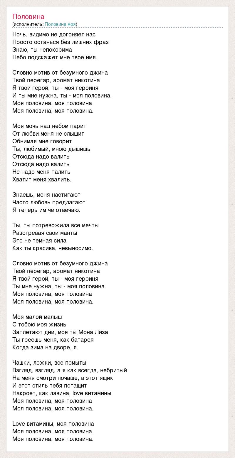 Ночь, видимо не догоняет нас Просто останься без лишних фраз Знаю, ты непокорима Небо подскажет мне твое имя. Словно мотив от безумного джина Твой перегар, аромат никотина Я твой герой, ты - моя героиня И ты мне нужна, ты - моя половина. Моя половина, моя половина Моя половина, моя половина. Моя мочь над небом парит От любви меня не слышит Обнимая мне говорит Ты, любимый, мною дышишь Отсюда надо валить Отсюда надо валить Не надо меня палить Хватит меня хвалить. Знаешь, меня настигают Часто любовь предлагают Я теперь им че отвечаю. Ты, ты потревожила все мечты Разогревая свои манты Это не темная сила Как ты красива, невыносимо. Словно мотив от безумного джина Твой перегар, аромат никотина Я твой герой, ты - моя героиня Ты мне нужна, ты - моя половина. Моя половина, моя половина Моя половина, моя половина. Моя малой малыш С тобою моя жизнь Заплетают дни, моя ты Мона Лиза Ты греешь меня, как батарея Когда зима на дворе, я. Чашки, ложки, все помыты Взгляд, взгляд, а я как всегда, небритый На меня смотри почаще, в этот ящик И этот стиль тебя потащит Накроет, как лавина, love витамины Моя половина, моя половина Моя половина, моя половина. Love витамины, моя половина Моя половина, моя половина Моя половина, моя половина.