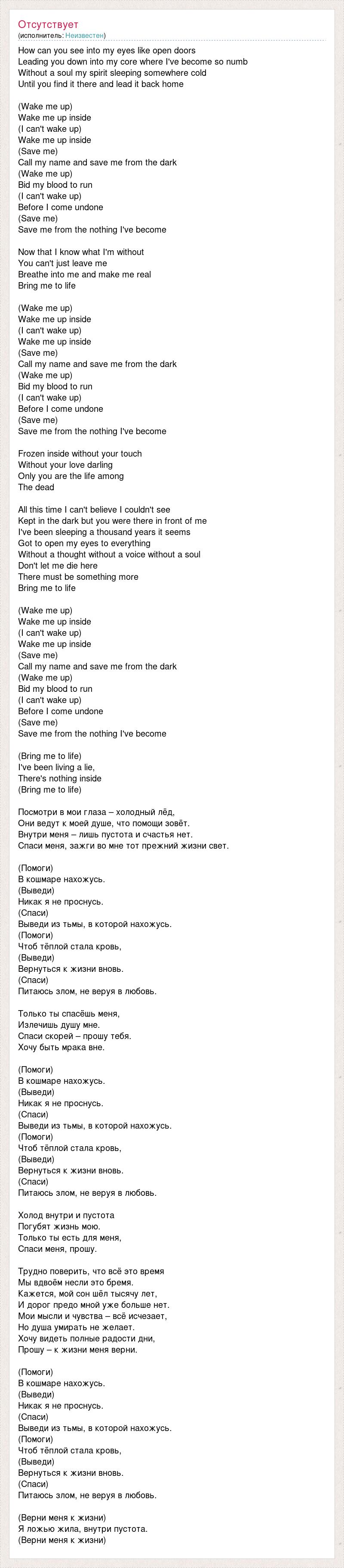 How can you see into my eyes like open doors Leading you down into my core where I've become so numb Without a soul my spirit sleeping somewhere cold Until you find it there and lead it back home (Wake me up) Wake me up inside (I can't wake up) Wake me up inside (Save me) Call my name and save me from the dark (Wake me up) Bid my blood to run (I can't wake up) Before I come undone (Save me) Save me from the nothing I've become Now that I know what I'm without You can't just leave me Breathe into me and make me real Bring me to life (Wake me up) Wake me up inside (I can't wake up) Wake me up inside (Save me) Call my name and save me from the dark (Wake me up) Bid my blood to run (I can't wake up) Before I come undone (Save me) Save me from the nothing I've become Frozen inside without your touch Without your love darling Only you are the life among The dead All this time I can't believe I couldn't see Kept in the dark but you were there in front of me I've been sleeping a thousand years it seems Got to open my eyes to everything Without a thought without a voice without a soul Don't let me die here There must be something more Bring me to life (Wake me up) Wake me up inside (I can't wake up) Wake me up inside (Save me) Call my name and save me from the dark (Wake me up) Bid my blood to run (I can't wake up) Before I come undone (Save me) Save me from the nothing I've become (Bring me to life) I've been living a lie, There's nothing inside (Bring me to life) Посмотри в мои глаза – холодный лёд, Они ведут к моей душе, что помощи зовёт. Внутри меня – лишь пустота и счастья нет. Спаси меня, зажги во мне тот прежний жизни свет. (Помоги) В кошмаре нахожусь. (Выведи) Никак я не проснусь. (Спаси) Выведи из тьмы, в которой нахожусь. (Помоги) Чтоб тёплой стала кровь, (Выведи) Вернуться к жизни вновь. (Спаси) Питаюсь злом, не веруя в любовь. Только ты спасёшь меня, Излечишь душу мне. Спаси скорей – прошу тебя. Хочу быть мрака вне. (Помоги) В кошмаре нахожусь. (Выведи) Никак я не проснусь. (Спаси) Выведи из тьмы, в которой нахожусь. (Помоги) Чтоб тёплой стала кровь, (Выведи) Вернуться к жизни вновь. (Спаси) Питаюсь злом, не веруя в любовь. Холод внутри и пустота Погубят жизнь мою. Только ты есть для меня, Спаси меня, прошу. Трудно поверить, что всё это время Мы вдвоём несли это бремя. Кажется, мой сон шёл тысячу лет, И дорог предо мной уже больше нет. Мои мысли и чувства – всё исчезает, Но душа умирать не желает. Хочу видеть полные радости дни, Прошу – к жизни меня верни. (Помоги) В кошмаре нахожусь. (Выведи) Никак я не проснусь. (Спаси) Выведи из тьмы, в которой нахожусь. (Помоги) Чтоб тёплой стала кровь, (Выведи) Вернуться к жизни вновь. (Спаси) Питаюсь злом, не веруя в любовь. (Верни меня к жизни) Я ложью жила, внутри пустота. (Верни меня к жизни)