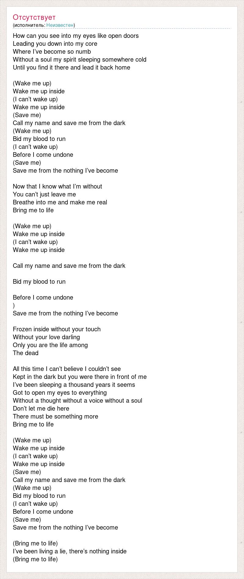 How can you see into my eyes like open doors Leading you down into my core Where I’ve become so numb Without a soul my spirit sleeping somewhere cold Until you find it there and lead it back home (Wake me up) Wake me up inside (I can’t wake up) Wake me up inside (Save me) Call my name and save me from the dark (Wake me up) Bid my blood to run (I can’t wake up) Before I come undone (Save me) Save me from the nothing I’ve become Now that I know what I’m without You can’t just leave me Breathe into me and make me real Bring me to life (Wake me up) Wake me up inside (I can’t wake up) Wake me up inside Call my name and save me from the dark Bid my blood to run Before I come undone ) Save me from the nothing I’ve become Frozen inside without your touch Without your love darling Only you are the life among The dead All this time I can’t believe I couldn’t see Kept in the dark but you were there in front of me I’ve been sleeping a thousand years it seems Got to open my eyes to everything Without a thought without a voice without a soul Don’t let me die here There must be something more Bring me to life (Wake me up) Wake me up inside (I can’t wake up) Wake me up inside (Save me) Call my name and save me from the dark (Wake me up) Bid my blood to run (I can’t wake up) Before I come undone (Save me) Save me from the nothing I’ve become (Bring me to life) I’ve been living a lie, there’s nothing inside (Bring me to life)