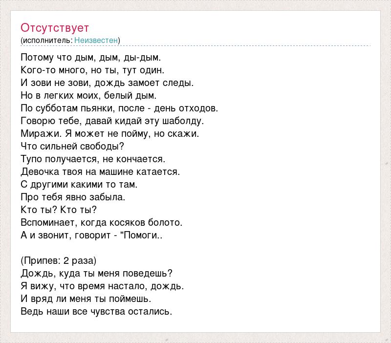 Потому что дым, дым, ды-дым. Кого-то много, но ты, тут один. И зови не зови, дождь замоет следы. Но в легких моих, белый дым. По субботам пьянки, после - день отходов. Говорю тебе, давай кидай эту шаболду. Миражи. Я может не пойму, но скажи. Что сильней свободы? Тупо получается, не кончается. Девочка твоя на машине катается. С другими какими то там. Про тебя явно забыла. Кто ты? Кто ты? Вспоминает, когда косяков болото. А и звонит, говорит - "Помоги.. (Припев: 2 раза) Дождь, куда ты меня поведешь? Я вижу, что время настало, дождь. И вряд ли меня ты поймешь. Ведь наши все чувства остались.