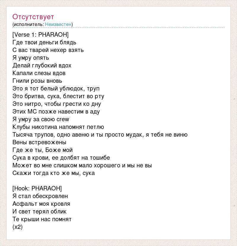 [Verse 1: PHARAOH] Где твои деньги блядь С вас тварей нехер взять Я умру опять Делай глубокий вдох Капали слезы вдов Гнили розы вновь Это я тот белый ублюдок, труп Это бритва, сука, блестит во рту Это нитро, чтобы грести ко дну Этих MC позже навестим в аду Я умру за свою crew Клубы никотина напомнят петлю Тысяча трупов, одно авеню и ты просто мудак, я тебя не виню Вены встревожены Где же ты, Боже мой Сука в крови, ее долбят на тошибе Может во мне слишком мало хорошего и мы не вы Скажи тогда кто же мы, сука [Hook: PHARAOH] Я стал обескровлен Асфальт моя кровля И свет терял облик Те крыши нас помнят (x2)