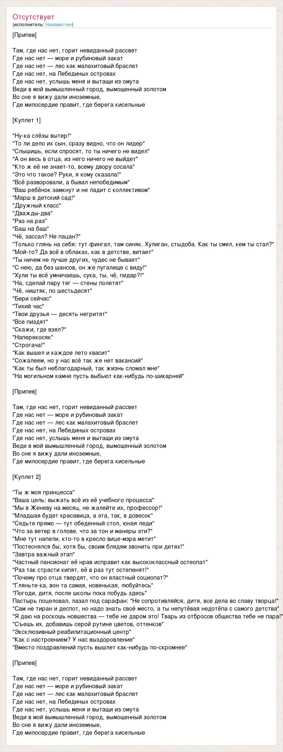 [Припев] Там, где нас нет, горит невиданный рассвет Где нас нет — море и рубиновый закат Где нас нет — лес как малахитовый браслет Где нас нет, на Лебединых островах Где нас нет, услышь меня и вытащи из омута Веди в мой вымышленный город, вымощенный золотом Во сне я вижу дали иноземные, Где милосердие правит, где берега кисельные [Куплет 1] "Ну-ка слёзы вытер!" "То ли дело их сын, сразу видно, что он лидер" "Слышишь, если спросят, то ты ничего не видел" "А он весь в отца, из него ничего не выйдет" "Кто ж её не знает-то, всему двору сосала" "Это что такое? Руки, я кому сказала!" "Всё разворовали, а бывал непобедимым" "Ваш ребёнок замкнут и не ладит с коллективом" "Марш в детский сад!" "Дружный класс" "Дважды-два" "Раз на раз" "Баш на баш" "Чё, зассал? Не пацан?" "Только глянь на себя: тут фингал, там синяк. Хулиган, стыдоба. Как ты смел, кем ты стал?" "Мой-то? Да всё в облаках, как в детстве, витает" "Ты ничем не лучше других, чудес не бывает" "С нею, да без шансов, он же пугалище с виду!" "Хули ты всё умничаешь, сука, ты, чё, пидар?!" "На, сделай пару тяг — стены полетят" "Чё, ништяк, по шестьдесят" "Бери сейчас" "Тихий час" "Твои друзья — десять негритят" "Все пиздят" "Скажи, где взял?" "Наперекосяк" "Строгача!" "Как вышел и каждое лето квасит" "Сожалеем, но у нас всё так же нет вакансий" "Как ты был неблагодарный, так жизнь сломал мне" "На могильном камне пусть выбьют как-нибудь по-шикарней" [Припев] Там, где нас нет, горит невиданный рассвет Где нас нет — море и рубиновый закат Где нас нет — лес как малахитовый браслет Где нас нет, на Лебединых островах Где нас нет, услышь меня и вытащи из омута Веди в мой вымышленный город, вымощенный золотом Во сне я вижу дали иноземные, Где милосердие правит, где берега кисельные [Куплет 2] "Ты ж моя принцесса" "Ваша цель: выжать всё из её учебного процесса" "Мы в Женеву на месяц, не жалейте их, профессор!" "Младшая будет красавица, а эта, так, в довесок" "Сядьте прямо — тут обеденный стол, юная леди" "Что за ветер в голове, что за тон и манеры эти?" "Мне тут напели, кто-то в кресло вице-мэра метит" "Постеснялся бы, хотя бы, своим блядям звонить при детях!" "Завтра важный этап" "Частный пансионат её нрав исправит как высококлассный остеопат" "Раз так страсти кипят, её в раз тут остепенят!" "Почему про отца твердят, что он властный социопат?" "Гляньте-ка, вон та самая, новенькая, любуйтесь" "Погоди, дитя, после школы пока побудь здесь" Пастырь поцеловал, лазал под сарафан: "Не сопротивляйся, дитя, все дела во славу творца!" "Сам не тиран и деспот, но надо знать своё место, а ты непутёвая недотёпа с самого детства" "Я даю на роскошь новшества — тебе не даром это! Тварь из отбросов общества тебе не пара!" "Съешь их, добавишь серой рутине цветов, оттенков" "Эксклюзивный реабилитационный центр" "Как с настроением? У нас выздоровление" "Вместо поздравлений пусть вышлет как-нибудь по-скромнее" [Припев] Там, где нас нет, горит невиданный рассвет Где нас нет — море и рубиновый закат Где нас нет — лес как малахитовый браслет Где нас нет, на Лебединых островах Где нас нет, услышь меня и вытащи из омута Веди в мой вымышленный город, вымощенный золотом Во сне я вижу дали иноземные, Где милосердие правит, где берега кисельные