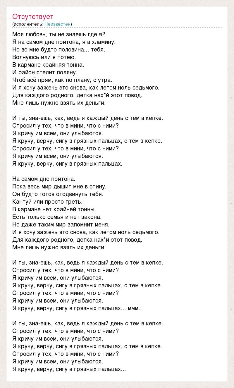 Моя любовь, ты не знаешь где я? Я на самом дне притона, я в хламину. Но во мне будто половина... тебя. Волнуюсь или я потею. В кармане крайняя тонна. И район стелит поляну. Чтоб всё прям, как по плану, с утра. И я хочу зажечь это снова, как летом ноль седьмого. Для каждого родного, детка нах*й этот повод. Мне лишь нужно взять их деньги. И ты, зна-ешь, как, ведь я каждый день с тем в кепке. Спросил у тех, что в мини, что с ними? Я кричу им всем, они улыбаются. Я кручу, верчу, сигу в грязных пальцах, с тем в кепке. Спросил у тех, что в мини, что с ними? Я кричу им всем, они улыбаются. Я кручу, верчу, сигу в грязных пальцах. На самом дне притона. Пока весь мир дышит мне в спину. Он будто готов отодвинуть тебя. Кантуй или просто греть. В кармане нет крайней тонны. Есть только семья и нет закона. Но даже таким мир запомнит меня. И я хочу зажечь это снова, как летом ноль седьмого. Для каждого родного, детка нах*й этот повод. Мне лишь нужно взять их деньги. И ты, зна-ешь, как, ведь я каждый день с тем в кепке. Спросил у тех, что в мини, что с ними? Я кричу им всем, они улыбаются. Я кручу, верчу, сигу в грязных пальцах, с тем в кепке. Спросил у тех, что в мини, что с ними? Я кричу им всем, они улыбаются. Я кручу, верчу, сигу в грязных пальцах... ммм.. И ты, зна-ешь, как, ведь я каждый день с тем в кепке. Спросил у тех, что в мини, что с ними? Я кричу им всем, они улыбаются. Я кручу, верчу, сигу в грязных пальцах, с тем в кепке. Спросил у тех, что в мини, что с ними? Я кричу им всем, они улыбаются. Я кручу, верчу, сигу в грязных пальцах...