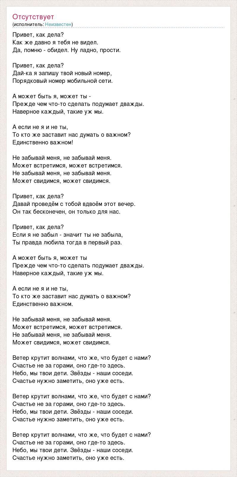 Привет, как дела? Как же давно я тебя не видел. Да, помню - обидел. Ну ладно, прости. Привет, как дела? Дай-ка я запишу твой новый номер, Порядковый номер мобильной сети. А может быть я, может ты - Прежде чем что-то сделать подумает дважды. Наверное каждый, такие уж мы. А если не я и не ты, То кто же заставит нас думать о важном? Единственно важном! Не забывай меня, не забывай меня. Может встретимся, может встретимся. Не забывай меня, не забывай меня. Может свидимся, может свидимся. Привет, как дела? Давай проведём с тобой вдвоём этот вечер. Он так бесконечен, он только для нас. Привет, как дела? Если я не забыл - значит ты не забыла, Ты правда любила тогда в первый раз. А может быть я, может ты Прежде чем что-то сделать подумает дважды. Наверное каждый, такие уж мы. А если не я и не ты, То кто же заставит нас думать о важном? Единственно важном. Не забывай меня, не забывай меня. Может встретимся, может встретимся. Не забывай меня, не забывай меня. Может свидимся, может свидимся. Ветер крутит волнами, что же, что будет с нами? Счастье не за горами, оно где-то здесь. Небо, мы твои дети. Звёзды - наши соседи. Счастье нужно заметить, оно уже есть. Ветер крутит волнами, что же, что будет с нами? Счастье не за горами, оно где-то здесь. Небо, мы твои дети. Звёзды - наши соседи. Счастье нужно заметить, оно уже есть. Ветер крутит волнами, что же, что будет с нами? Счастье не за горами, оно где-то здесь. Небо, мы твои дети. Звёзды - наши соседи. Счастье нужно заметить, оно уже есть.