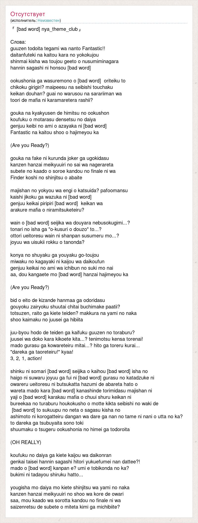 「 [bad word] nya_theme_club」 Слова: guuzen todoita tegami wa nanto Fantastic!! daitanfuteki na kaitou kara no yokokujou shinmai kisha wa toujou geeto o nusumiminagara hannin sagashi ni honsou [bad word] ookushonia ga wasuremono o [bad word] oriteiku to chikoku girigiri? maipeesu na seibishi touchaku keikan douhan? guai no warusou na sarariiman wa toori de mafia ni karamaretera rashii? gouka na kyakyusen de himitsu no ookushon koufuku o motarasu densetsu no daiya genjuu keibi no ami o azayaka ni [bad word] Fantastic na kaitou shoo o hajimeyou ka (Are you Ready?) gouka na fake ni kurunda joker ga ugokidasu kanzen hanzai meikyuuiri no sai wa nagerareta subete no kaado o soroe kandou no finale ni wa Finder koshi no shinjitsu o abaite majishan no yokyou wa engi o katsuida? pafoomansu kaishi jikoku ga wazuka ni [bad word] genjuu keikai piripiri [bad word] keikan wa arakure mafia o niramitsuketeiru? wain o [bad word] seijika wa douyara nebusokugimi...? tonari no isha ga "o-kusuri o douzo" to...? ottori ueitoresu wain ni shanpan susumeru mo...? joyuu wa uisukii rokku o tanonda? konya no shuyaku ga youyaku go-toujou miwaku no kagayaki ni kaijou wa daikoufun genjuu keikai no ami wa ichibun no suki mo nai aa, dou kangaete mo [bad word] hanzai hajimeyou ka (Are you Ready?) bid o eito de kizande hanmaa ga odoridasu gouyoku zairyoku shuutai chitai buchimake paatii? totsuzen, raito ga kiete teiden? makkura na yami no naka shoo kaimaku no juusei ga hibiita juu-byou hodo de teiden ga kaifuku guuzen no toraburu? juusei wa doko kara kikoete kita...? tenimotsu kensa torenai! mado gurasu ga kowareteiru mitai...? hito ga toreru kurai... "dareka ga taoreteiru!" kyaa! 3, 2, 1, action! shinku ni somari [bad word] seijika o kaihou [bad word] isha no haigo ni suwaru joyuu ga fui ni [bad word] gurasu no katadzuke ni owareru ueitoresu ni butsukatta hazumi de abareta hato o wareta mado kara [bad word] kanashinde torimidasu majishan ni yaji o [bad word] karakau mafia o chuui shuru keikan ni bureekaa no turaburu houkokusho o motte kikta seibishi no waki de [bad word] to sukuupu no neta o sagasu kisha no ashimoto ni korogatteiru dangan wa dare ga nan no tame ni nani o utta no ka? to dareka ga tsubuyaita sono toki shuumaku o tsugeru ookushonia no himei ga todoroita (OH REALLY) koufuku no daiya ga kiete kaijou wa daikonran genkai taisei hannin sagashi hitori yukuefumei nan dattee?! mado o [bad word] kanpan e? umi e tobikonda no ka? bukimi ni tadayou shiruku hatto... yougisha mo daiya mo kiete shinjitsu wa yami no naka kanzen hanzai meikyuuiri no shoo wa kore de owari saa, mou kaado wa sorotta kandou no finale ni wa saizenretsu de subete o miteta kimi ga michibiite?