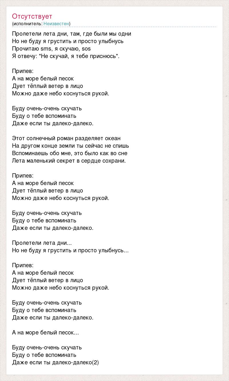 Пролетели лета дни, там, где были мы одни Но не буду я грустить и просто улыбнусь Прочитаю sms, я скучаю, sos Я отвечу: "Не скучай, я тебе приснюсь". Припев: А на море белый песок Дует тёплый ветер в лицо Можно даже небо коснуться рукой. Буду очень-очень скучать Буду о тебе вспоминать Даже если ты далеко-далеко. Этот солнечный роман разделяет океан На другом конце земли ты сейчас не спишь Вспоминаешь обо мне, это было как во сне Лета маленький секрет в сердце сохрани. Припев: А на море белый песок Дует тёплый ветер в лицо Можно даже небо коснуться рукой. Буду очень-очень скучать Буду о тебе вспоминать Даже если ты далеко-далеко. Пролетели лета дни... Но не буду я грустить и просто улыбнусь... Припев: А на море белый песок Дует тёплый ветер в лицо Можно даже небо коснуться рукой. Буду очень-очень скучать Буду о тебе вспоминать Даже если ты далеко-далеко. А на море белый песок... Буду очень-очень скучать Буду о тебе вспоминать Даже если ты далеко-далеко(2)