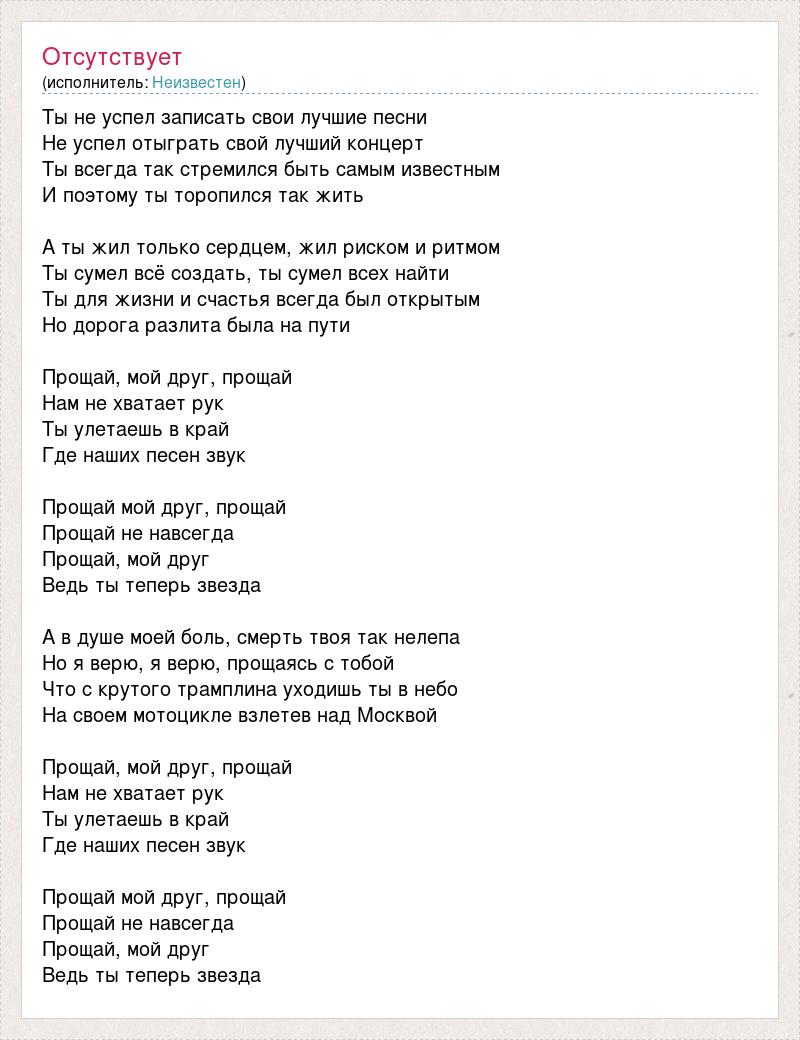 Ты не успел записать свои лучшие песни Не успел отыграть свой лучший концерт Ты всегда так стремился быть самым известным И поэтому ты торопился так жить А ты жил только сердцем, жил риском и ритмом Ты сумел всё создать, ты сумел всех найти Ты для жизни и счастья всегда был открытым Но дорога разлита была на пути Прощай, мой друг, прощай Нам не хватает рук Ты улетаешь в край Где наших песен звук Прощай мой друг, прощай Прощай не навсегда Прощай, мой друг Ведь ты теперь звезда А в душе моей боль, смерть твоя так нелепа Но я верю, я верю, прощаясь с тобой Что с крутого трамплина уходишь ты в небо На своем мотоцикле взлетев над Москвой Прощай, мой друг, прощай Нам не хватает рук Ты улетаешь в край Где наших песен звук Прощай мой друг, прощай Прощай не навсегда Прощай, мой друг Ведь ты теперь звезда