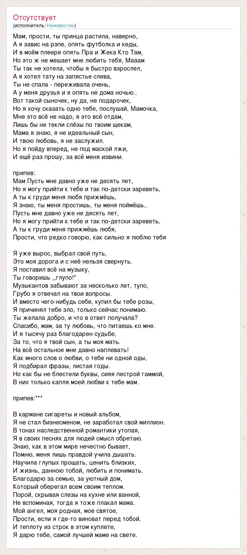 Мам, прости, ты принца растила, наверно, А я завис на рэпе, опять футболка и кеды, И в моём плеере опять Пра и Жека Кто Там, Но это ж не мешает мне любить тебя, Мааам Ты так не хотела, чтобы я быстро взрослел, А я хотел тату на запястье слева, Ты не спала - переживала очень, А у меня друзья и я опять не дома ночью.. Вот такой сыночек, ну да, не подарочек, Но я хочу сказать одно тебе, послушай, Мамочка, Мне это всё не надо, я это всё отдам, Лишь бы не текли слёзы по твоим щекам, Мама я знаю, я не идеальный сын, И твою любовь, я не заслужил. Но я пойду вперед, не под маской лжи, И ещё раз прошу, за всё меня извини. припев: Мам Пусть мне давно уже не десять лет, Но я могу прийти к тебе и так по-детски зареветь, А ты к груди меня любя прижмёшь, Я знаю, ты меня простишь, ты меня поймёшь.. Пусть мне давно уже не десять лет, Но я могу прийти к тебе и так по-детски зареветь, А ты к груди меня прижмёшь любя, Прости, что редко говорю, как сильно я люблю тебя Я уже вырос, выбрал свой путь, Это моя дорога и с неё нельзя свернуть. Я поставил всё на музыку, Ты говоришь ,,глупо!" Музыкантов забывают за несколько лет, тупо, Грубо я отвечал на твои вопросы. И вместо чего-нибудь себе, купил бы тебе розы, Я причинял тебе зло, только сейчас понимаю. Ты желала добро, и что в ответ получала? Спасибо, мам, за ту любовь, что питаешь ко мне. И я тысячу раз благодарен судьбе, За то, что я твой сын, а ты моя мать. На всё остальное мне давно наплевать! Как много слов о любви, о тебе ни одной оды, Я подбирал фразы, листая годы. Но как бы не блестели буквы, сияя пестрой гаммой, В них только капля моей любви к тебе мам. припев:*** В кармане сигареты и новый альбом, Я не стал бизнесменом, не заработал свой миллион. В тонах наследственной романтики утопая, Я в своих песнях для людей смысл обретаю. Знаю, как в этом мире нечестно бывает, Помню, меня лишь правдой учила дышать. Научила глупых прощать, ценить близких, И жизнь, данною тобой, любить и понимать. Благодарю за семью, за уютный дом, Который оберегал всем своим теплом. Порой, скрывая слезы на кухне или ванной, Не вспоминая, тогда я тоже плакал мама. Мой ангел, моя родная, мое святое, Прости, если я где-то виноват перед тобой. И теплоту из строк в этом куплете, Я дарю тебе, самой лучшей маме на свете.