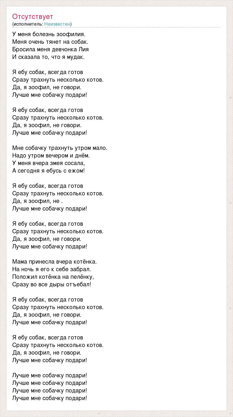 У меня болезнь зоофилия. Меня очень тянет на собак. Бросила меня девчонка Лия И сказала то, что я мудак. Я ебу собак, всегда готов Сразу трахнуть несколько котов. Да, я зоофил, не говори. Лучше мне собачку подари! Я ебу собак, всегда готов Сразу трахнуть несколько котов. Да, я зоофил, не говори. Лучше мне собачку подари! Мне собачку трахнуть утром мало. Надо утром вечером и днём. У меня вчера змея сосала, А сегодня я ебусь с ежом! Я ебу собак, всегда готов Сразу трахнуть несколько котов. Да, я зоофил, не . Лучше мне собачку подари! Я ебу собак, всегда готов Сразу трахнуть несколько котов. Да, я зоофил, не говори. Лучше мне собачку подари! Мама принесла вчера котёнка. На ночь я его к себе забрал. Положил котёнка на пелёнку, Сразу во все дыры отъебал! Я ебу собак, всегда готов Сразу трахнуть несколько котов. Да, я зоофил, не говори. Лучше мне собачку подари! Я ебу собак, всегда готов Сразу трахнуть несколько котов. Да, я зоофил, не говори. Лучше мне собачку подари! Лучше мне собачку подари! Лучше мне собачку подари! Лучше мне собачку подари! Лучше мне собачку подари!