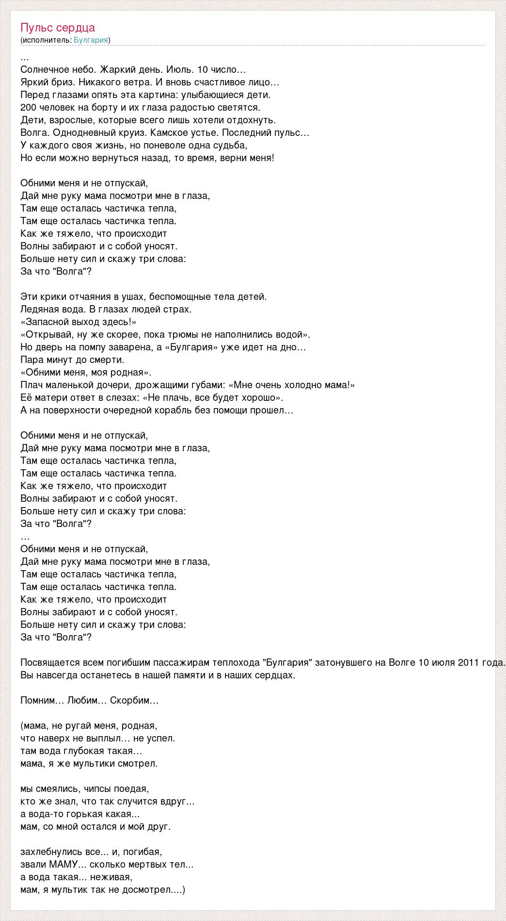 ... Солнечное небо. Жаркий день. Июль. 10 число… Яркий бриз. Никакого ветра. И вновь счастливое лицо… Перед глазами опять эта картина: улыбающиеся дети. 200 человек на борту и их глаза радостью светятся. Дети, взрослые, которые всего лишь хотели отдохнуть. Волга. Однодневный круиз. Камское устье. Последний пульс… У каждого своя жизнь, но поневоле одна судьба, Но если можно вернуться назад, то время, верни меня! Обними меня и не отпускай, Дай мне руку мама посмотри мне в глаза, Там еще осталась частичка тепла, Там еще осталась частичка тепла. Как же тяжело, что происходит Волны забирают и с собой уносят. Больше нету сил и скажу три слова: За что "Волга"? Эти крики отчаяния в ушах, беспомощные тела детей. Ледяная вода. В глазах людей страх. «Запасной выход здесь!» «Открывай, ну же скорее, пока трюмы не наполнились водой». Но дверь на помпу заварена, а «Булгария» уже идет на дно… Пара минут до смерти. «Обними меня, моя родная». Плач маленькой дочери, дрожащими губами: «Мне очень холодно мама!» Её матери ответ в слезах: «Не плачь, все будет хорошо». А на поверхности очередной корабль без помощи прошел… Обними меня и не отпускай, Дай мне руку мама посмотри мне в глаза, Там еще осталась частичка тепла, Там еще осталась частичка тепла. Как же тяжело, что происходит Волны забирают и с собой уносят. Больше нету сил и скажу три слова: За что "Волга"? … Обними меня и не отпускай, Дай мне руку мама посмотри мне в глаза, Там еще осталась частичка тепла, Там еще осталась частичка тепла. Как же тяжело, что происходит Волны забирают и с собой уносят. Больше нету сил и скажу три слова: За что "Волга"? Посвящается всем погибшим пассажирам теплохода "Булгария" затонувшего на Волге 10 июля 2011 года. Вы навсегда останетесь в нашей памяти и в наших сердцах. Помним… Любим… Скорбим… (мама, не ругай меня, родная, что наверх не выплыл… не успел. там вода глубокая такая… мама, я же мультики смотрел. мы смеялись, чипсы поедая, кто же знал, что так случится вдруг... а вода-то горькая какая... мам, со мной остался и мой друг. захлебнулись все... и, погибая, звали МАМУ... сколько мертвых тел... а вода такая... неживая, мам, я мультик так не досмотрел....)