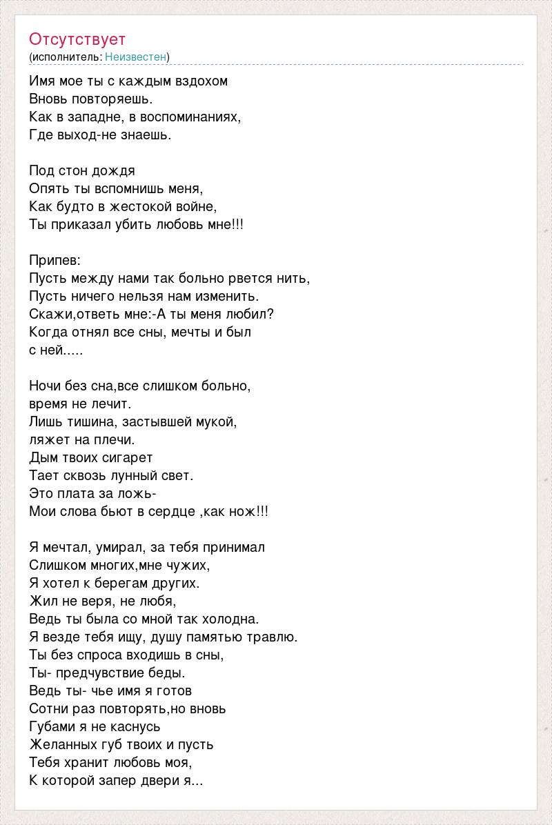 Имя мое ты с каждым вздохом Вновь повторяешь. Как в западне, в воспоминаниях, Где выход-не знаешь. Под стон дождя Опять ты вспомнишь меня, Как будто в жестокой войне, Ты приказал убить любовь мне!!! Припев: Пусть между нами так больно рвется нить, Пусть ничего нельзя нам изменить. Скажи,ответь мне:-А ты меня любил? Когда отнял все сны, мечты и был с ней..... Ночи без сна,все слишком больно, время не лечит. Лишь тишина, застывшей мукой, ляжет на плечи. Дым твоих сигарет Тает сквозь лунный свет. Это плата за ложь- Мои слова бьют в сердце ,как нож!!! Я мечтал, умирал, за тебя принимал Слишком многих,мне чужих, Я хотел к берегам других. Жил не веря, не любя, Ведь ты была со мной так холодна. Я везде тебя ищу, душу памятью травлю. Ты без спроса входишь в сны, Ты- предчувствие беды. Ведь ты- чье имя я готов Сотни раз повторять,но вновь Губами я не каснусь Желанных губ твоих и пусть Тебя хранит любовь моя, К которой запер двери я...