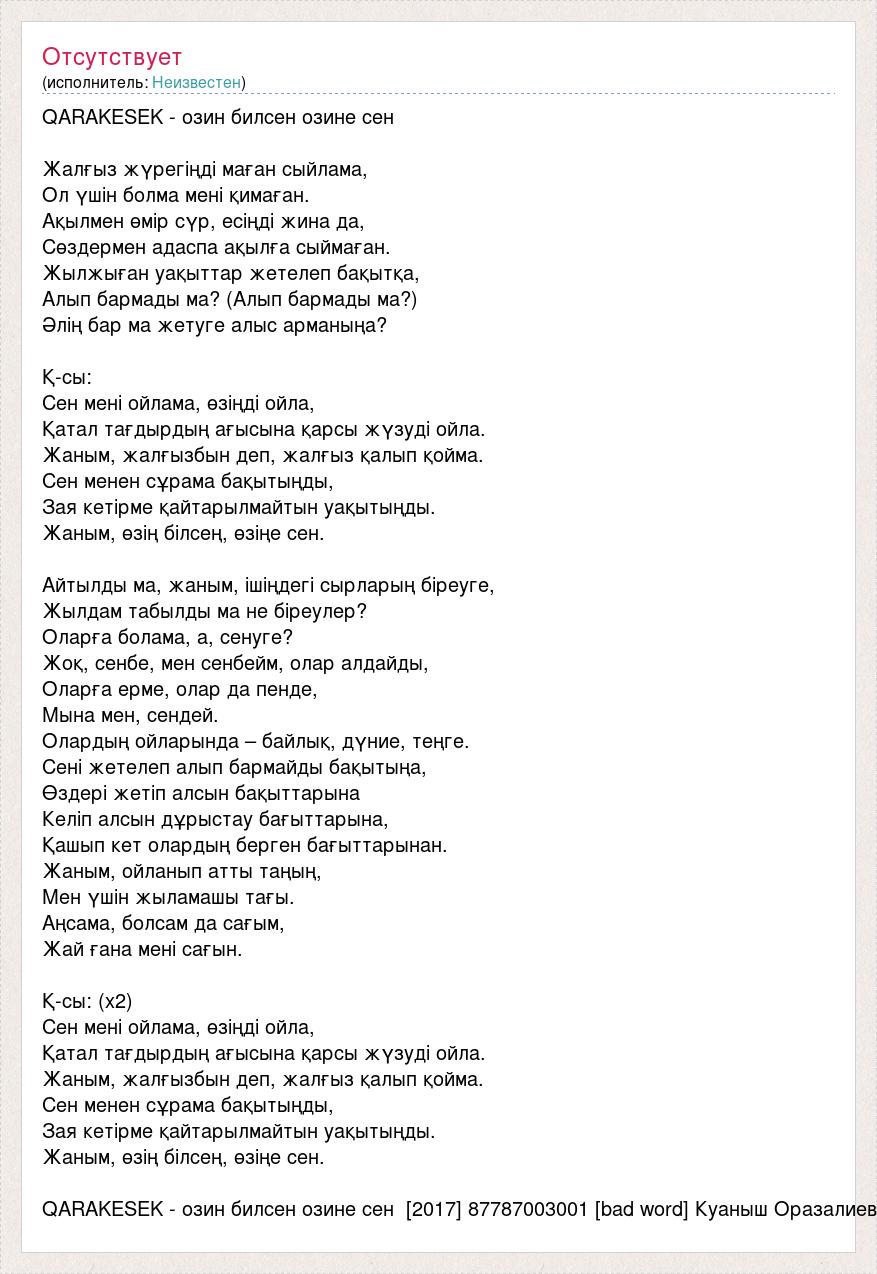 QARAKESEK - озин билсен озине сен Жалғыз жүрегіңді маған сыйлама, Ол үшін болма мені қимаған. Ақылмен өмір сүр, есіңді жина да, Сөздермен адаспа ақылға сыймаған. Жылжыған уақыттар жетелеп бақытқа, Алып бармады ма? (Алып бармады ма?) Әлің бар ма жетуге алыс арманыңа? Қ-сы: Сен мені ойлама, өзіңді ойла, Қатал тағдырдың ағысына қарсы жүзуді ойла. Жаным, жалғызбын деп, жалғыз қалып қойма. Сен менен сұрама бақытыңды, Зая кетірме қайтарылмайтын уақытыңды. Жаным, өзің білсең, өзіңе сен. Айтылды ма, жаным, ішіңдегі сырларың біреуге, Жылдам табылды ма не біреулер? Оларға болама, а, сенуге? Жоқ, сенбе, мен сенбейм, олар алдайды, Оларға ерме, олар да пенде, Мына мен, сендей. Олардың ойларында – байлық, дүние, теңге. Сені жетелеп алып бармайды бақытыңа, Өздері жетіп алсын бақыттарына Келіп алсын дұрыстау бағыттарына, Қашып кет олардың берген бағыттарынан. Жаным, ойланып атты таңың, Мен үшін жыламашы тағы. Аңсама, болсам да сағым, Жай ғана мені сағын. Қ-сы: (х2) Сен мені ойлама, өзіңді ойла, Қатал тағдырдың ағысына қарсы жүзуді ойла. Жаным, жалғызбын деп, жалғыз қалып қойма. Сен менен сұрама бақытыңды, Зая кетірме қайтарылмайтын уақытыңды. Жаным, өзің білсең, өзіңе сен. QARAKESEK - озин билсен озине сен [2017] 87787003001 [bad word] Куаныш Оразалиев